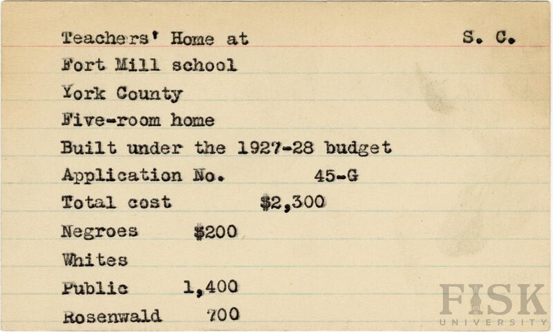 School card from Rosenwald Fund for the five room teacher's home at Fort Mill School in York County, South Carolina
