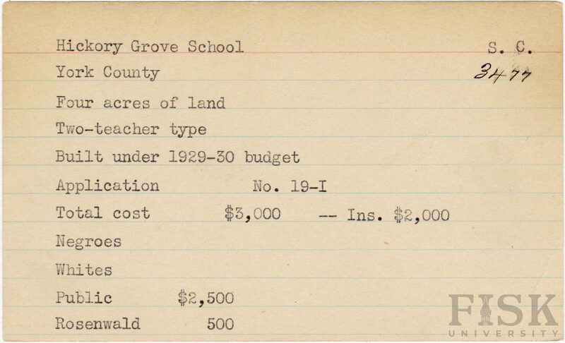 - Julius Rosenwald Fund--Buildings, African American schools--History--20th century, African American schools -- Hickory Grove School