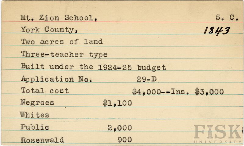 - School card from Rosenwald Fund for Mt. Zion School in York County, South Carolina with a section added to the budget contributions that says, "Ins. $3,000"