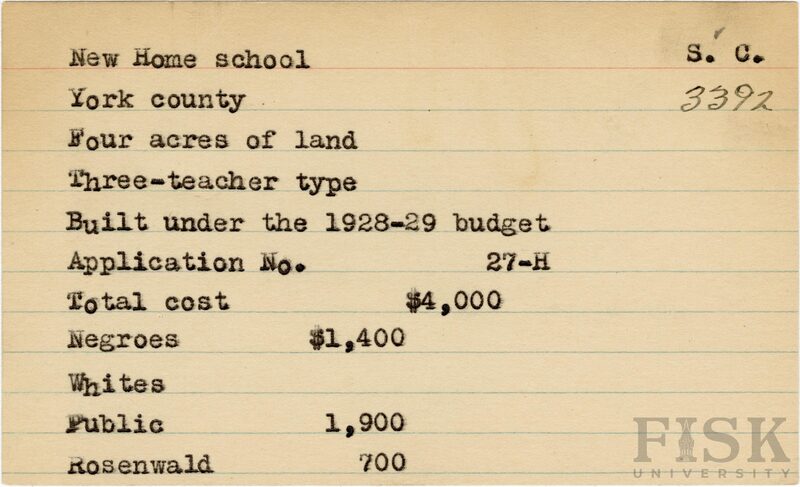 - School card from Rosenwald Fund for New Home School in York County, South Carolina
