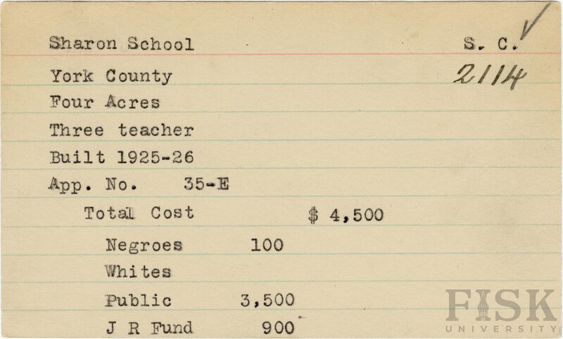 - School card from Rosenwald Fund for Sharon School in York County, South Carolina