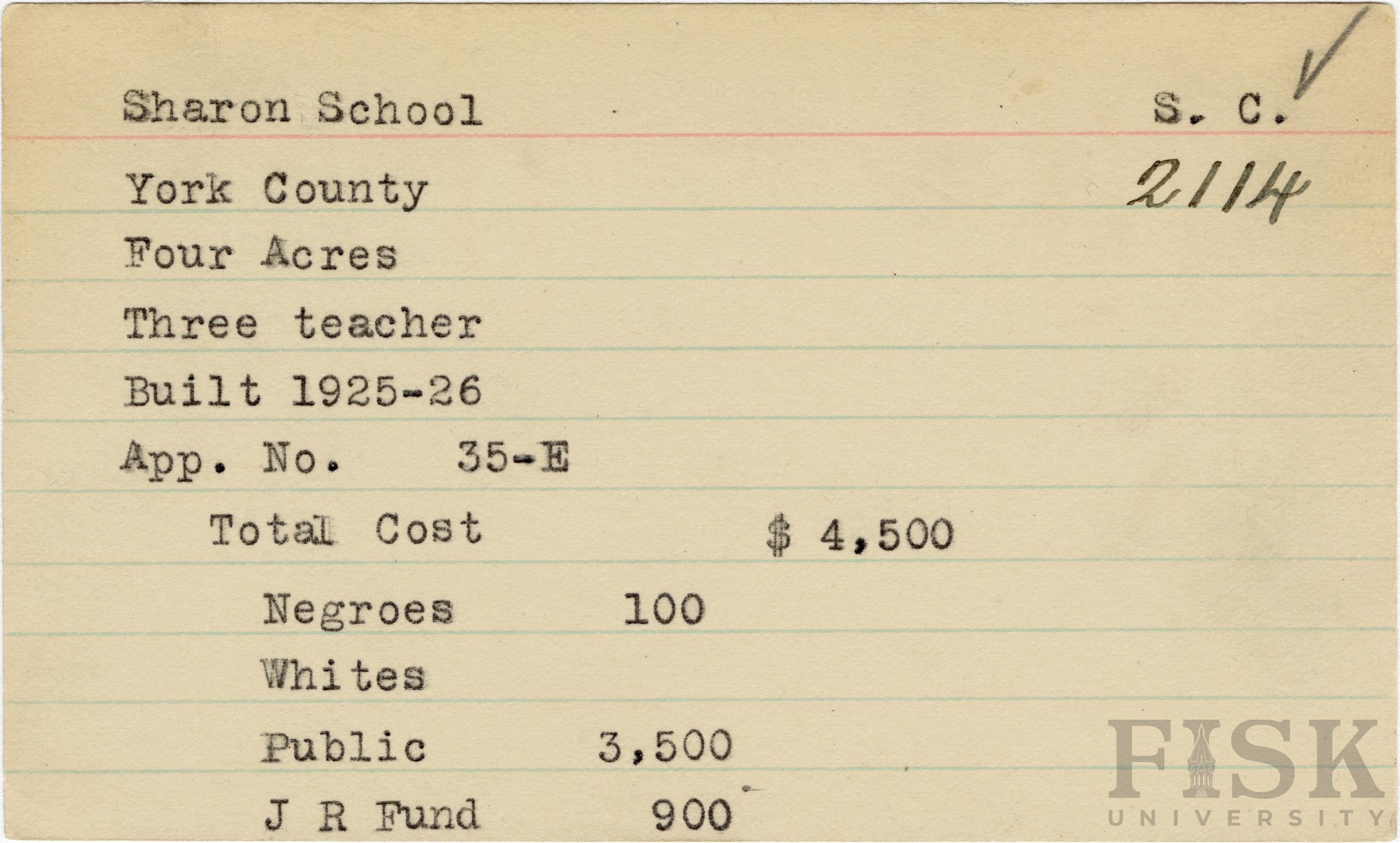 School card from Rosenwald Fund for Sharon School in York County, South Carolina