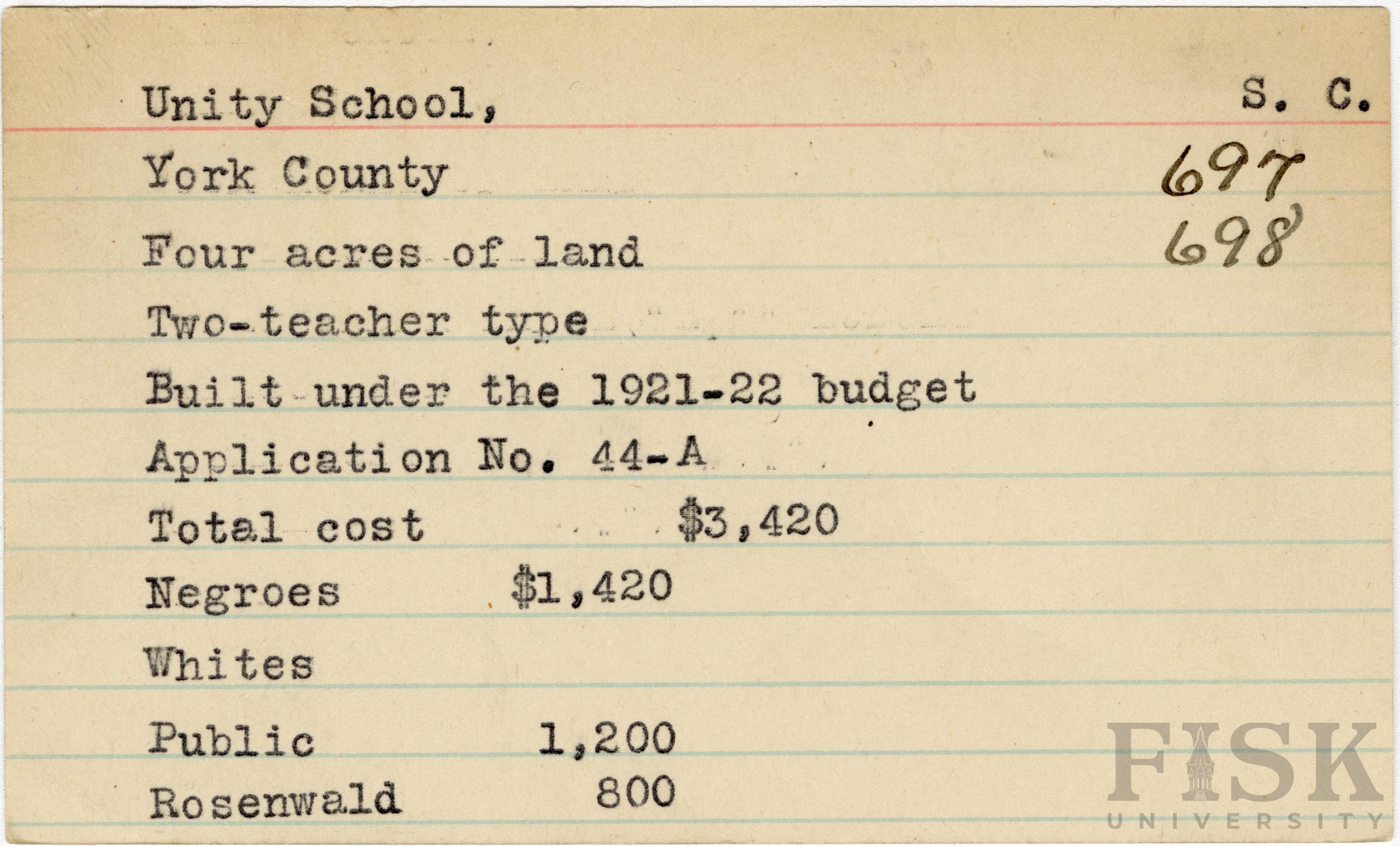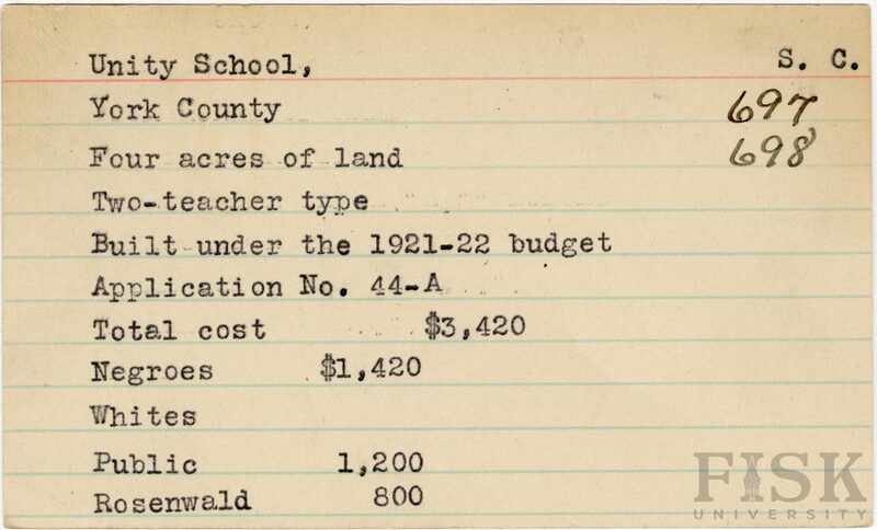 - School card from Rosenwald Fund for Unity School in York County, South Carolina