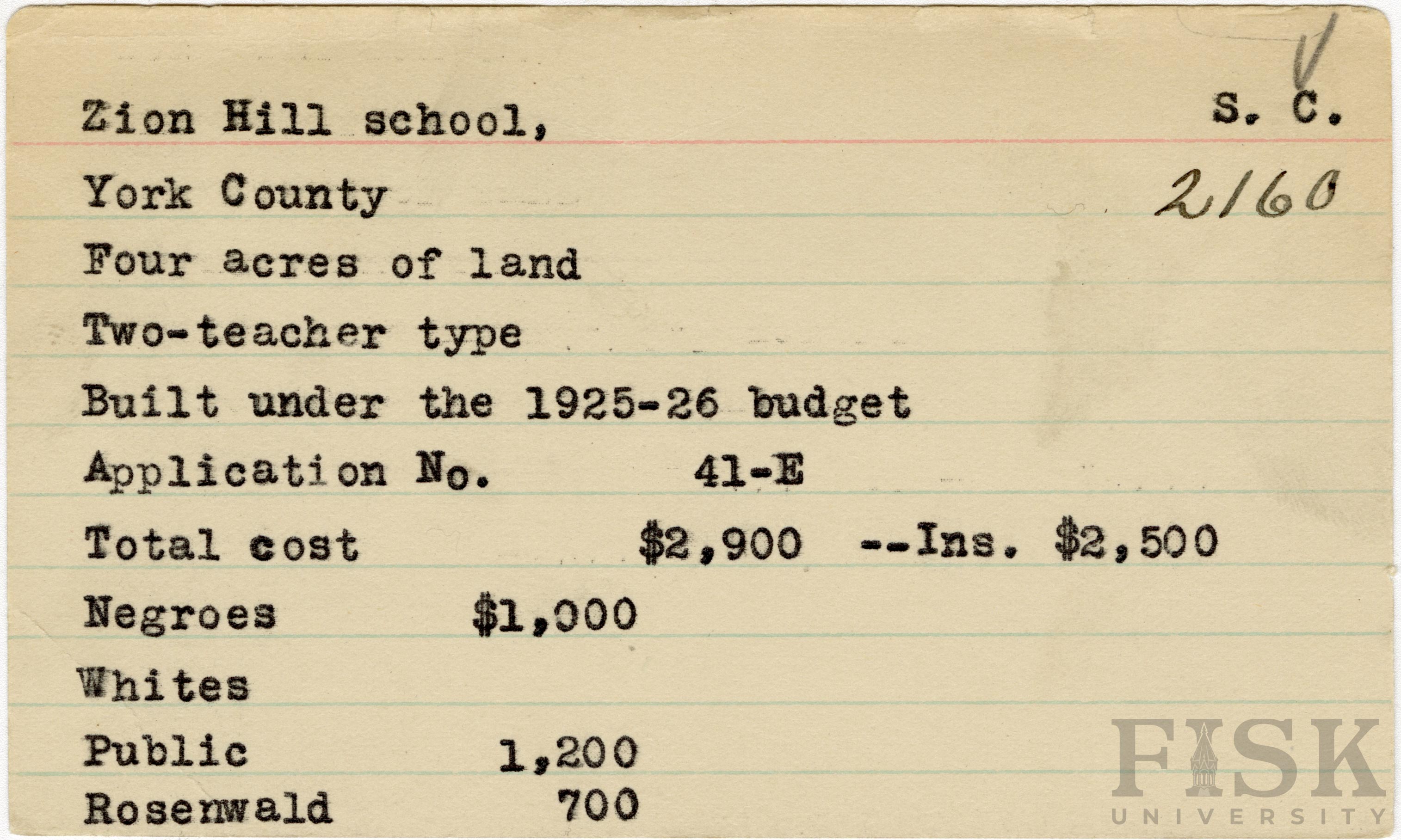 - School card from Rosenwald Fund for Zion Hill School in York County, South Carolina with a section added to the budget contributions that says, "Ins. $2,500"