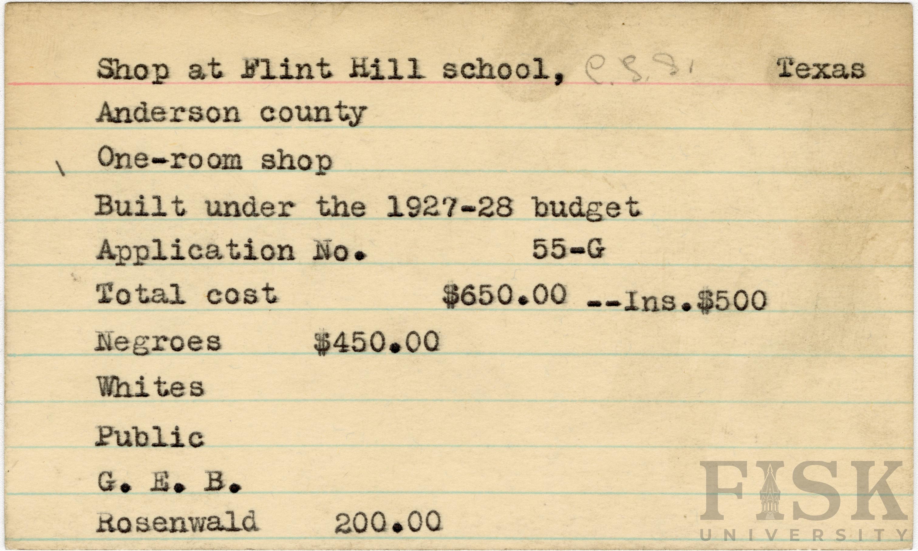 School card from Rosenwald Fund for the one room shop at Flint Hill School in Anderson County, Texas with a section added to the budget contributions that says, "Ins. $500"