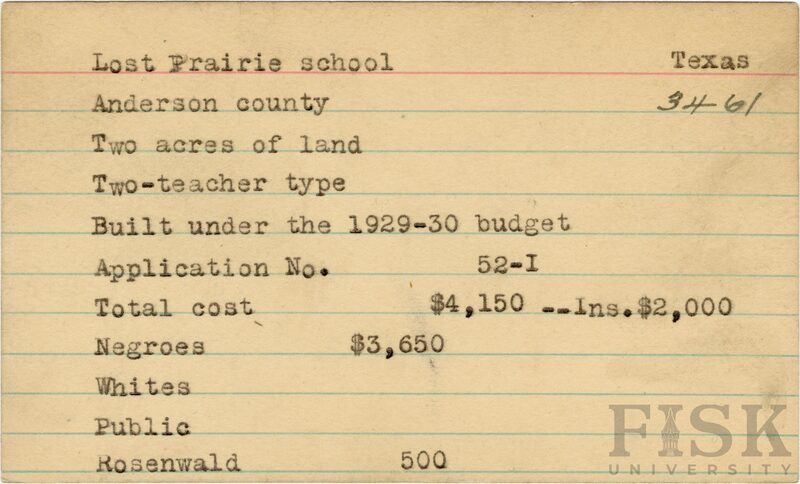 - School card from Rosenwald Fund for Lost Prairie School in Anderson County, Texas with a section added to the budget contributions that says, "Ins. $2,000"