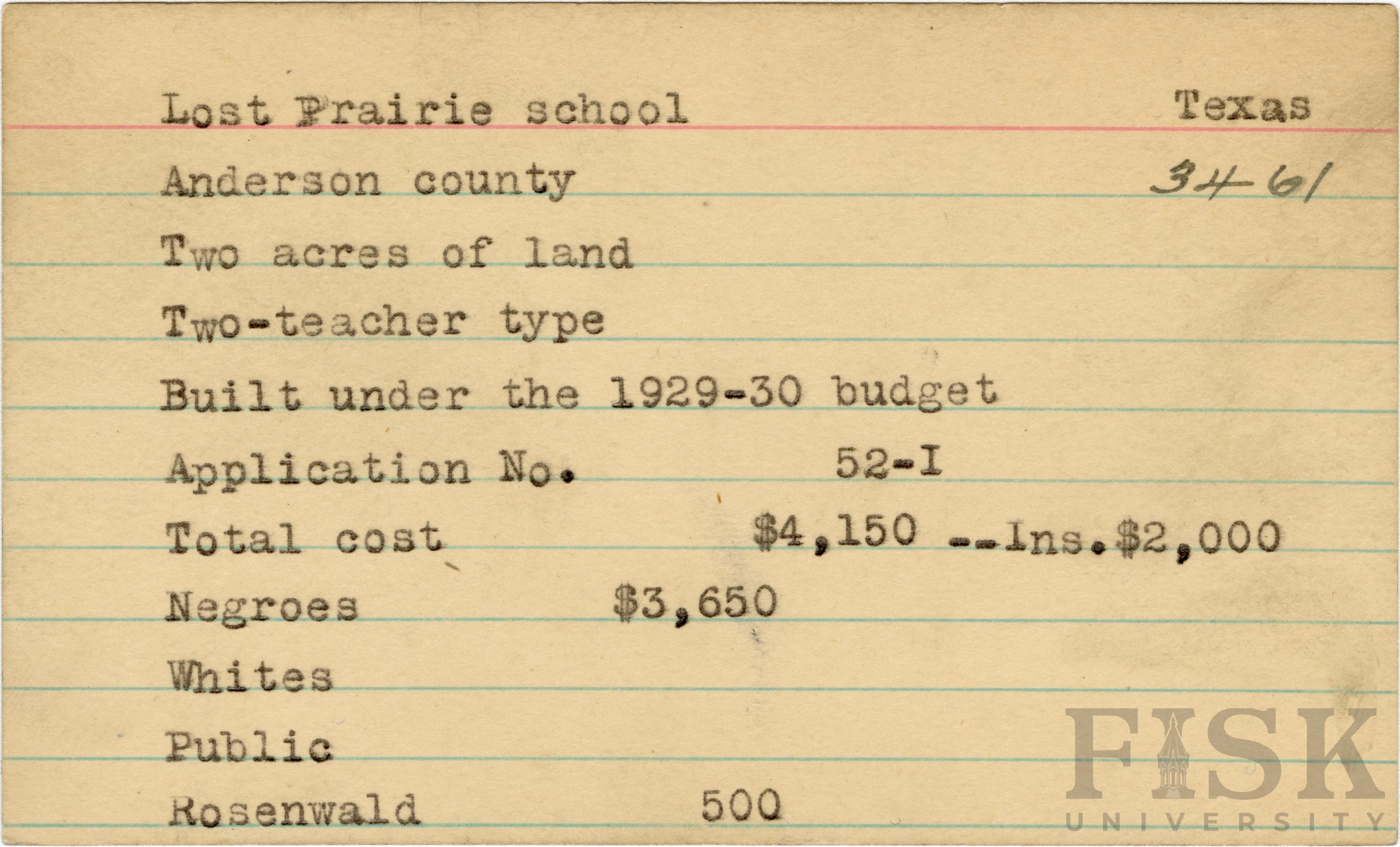 School card from Rosenwald Fund for Lost Prairie School in Anderson County, Texas with a section added to the budget contributions that says, "Ins. $2,000"