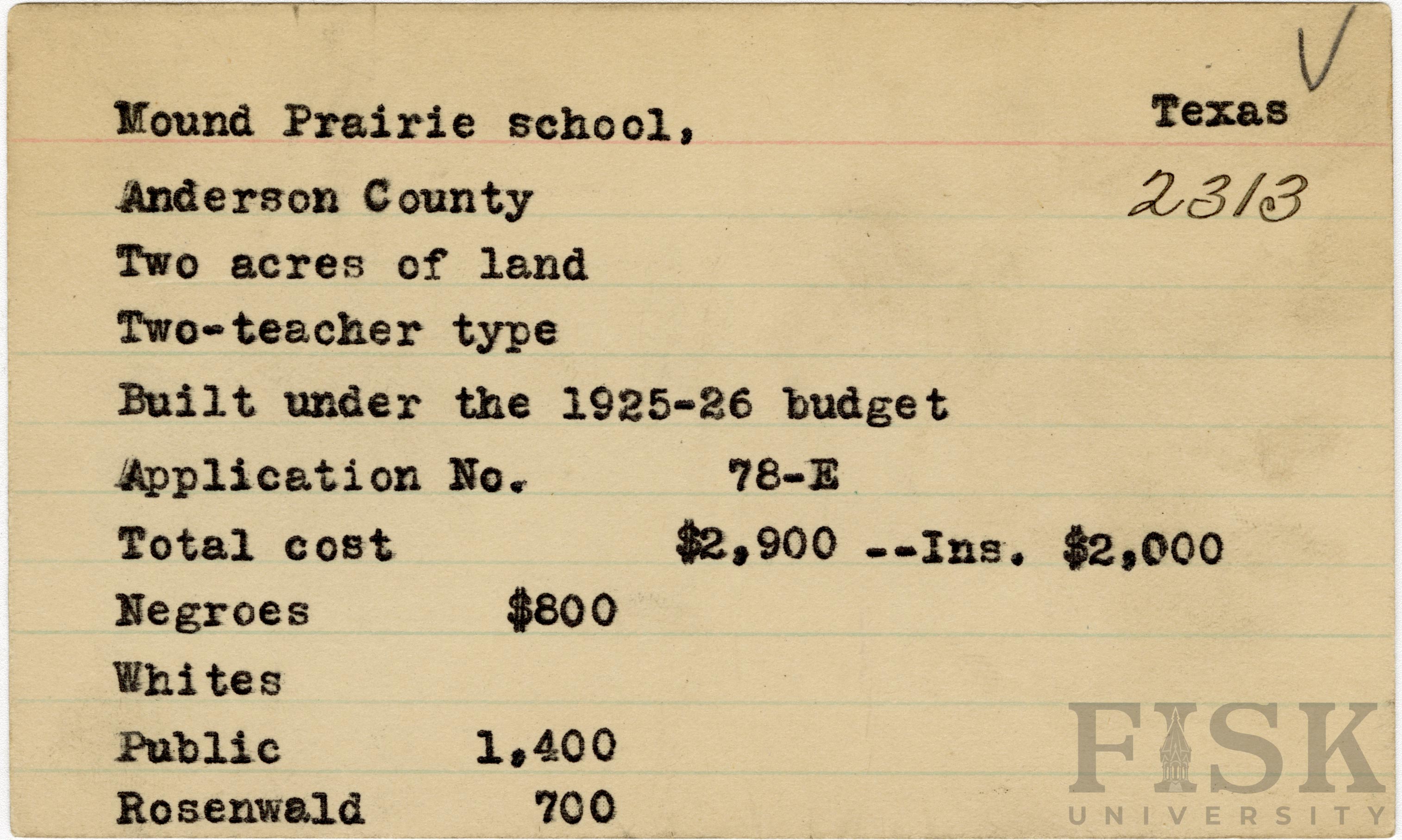 School card from Rosenwald Fund for Mound Prairie School in Anderson County, Texas with a section added to the budget contributions that says, "Ins. $2,000"