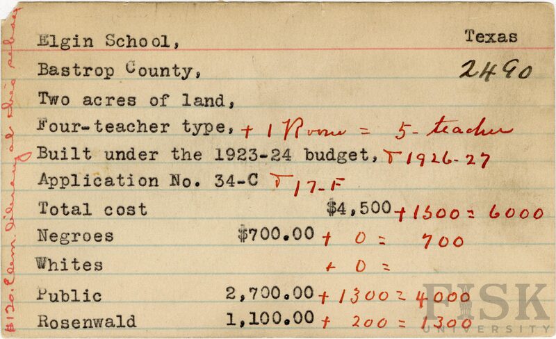 - School card from Rosenwald Fund for Elgin School in Bastrop County, Texas with handwritten additions to the teacher type, budget year, application number, and budget contribution sections. A note on the card says, "$120 elem library at this school"