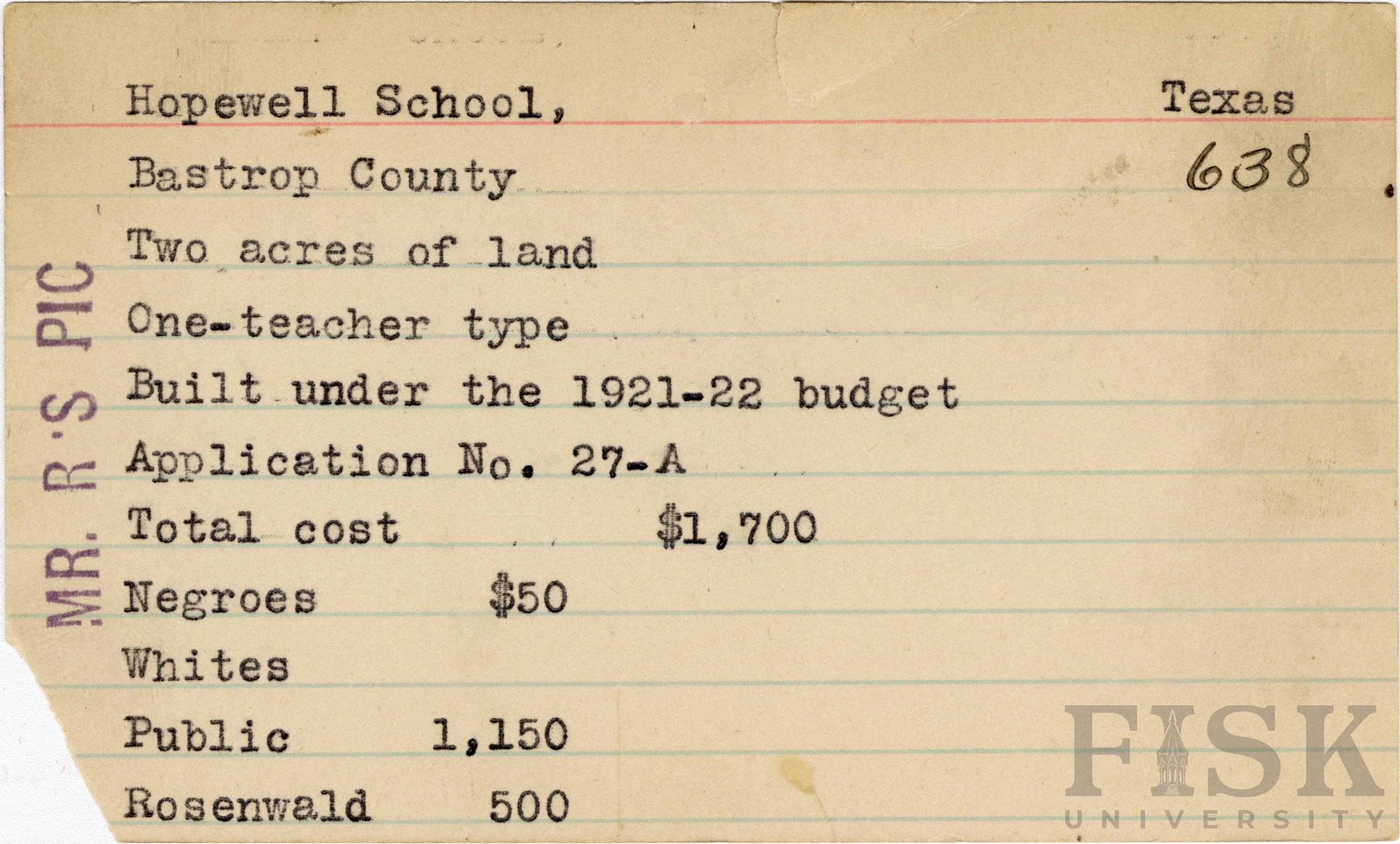 - School card from Rosenwald Fund for Hopewell School in Bastrop County, Texas with a note on the card that says, "Mr. R's Pic"