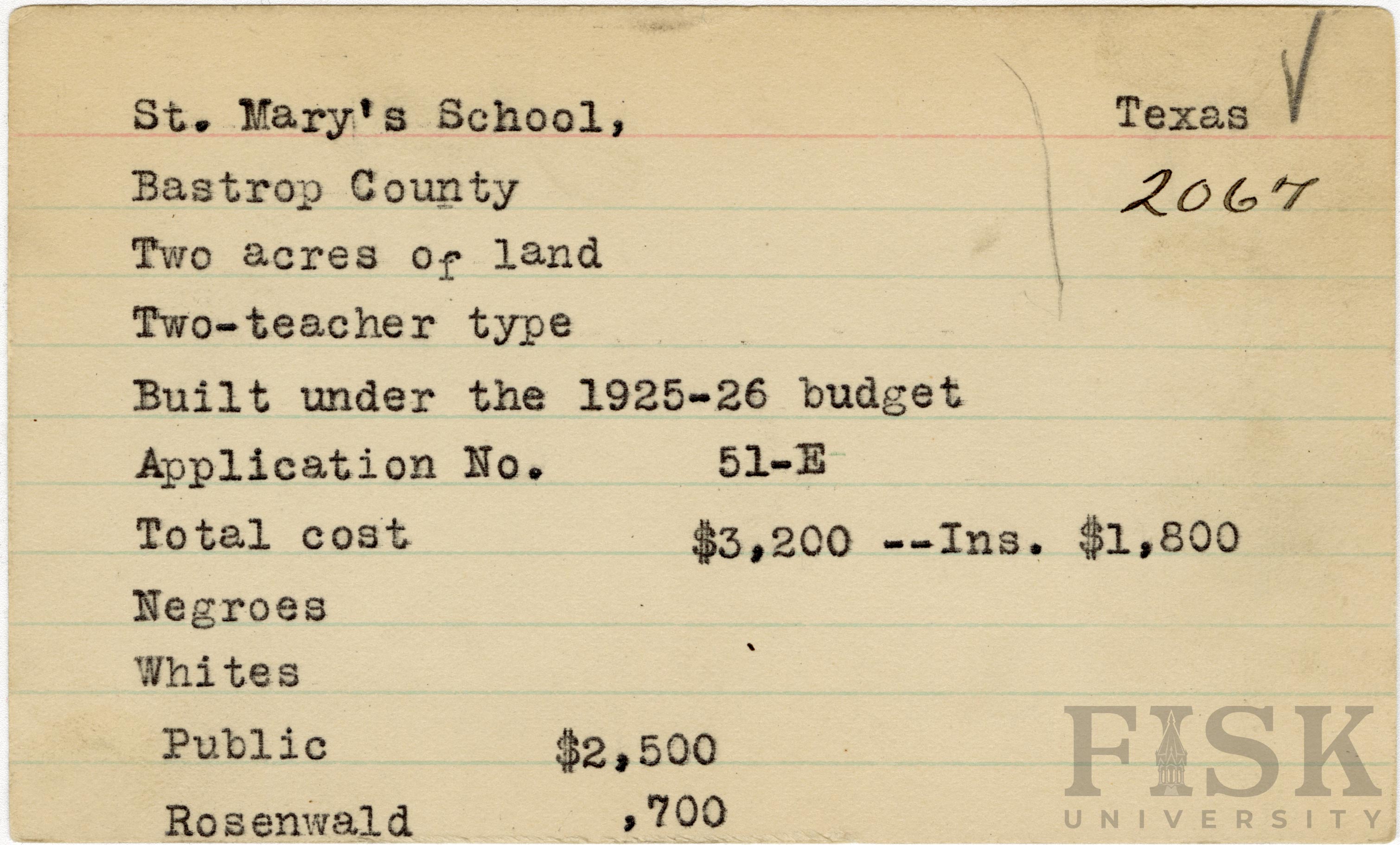 School card from Rosenwald Fund for St. Mary's School in Bastrop County, Texas with a section added to the budget contributions that says, "Ins. $1,800"