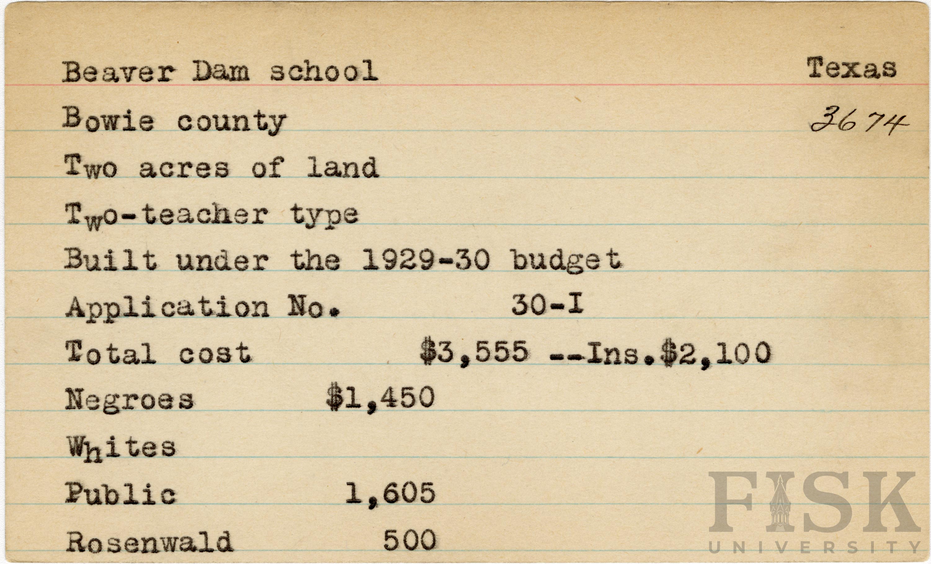 - School card from Rosenwald Fund for Beaver Dam School in Bowie County, Texas with a section added to the budget contributions that says, "Ins. $2,100"