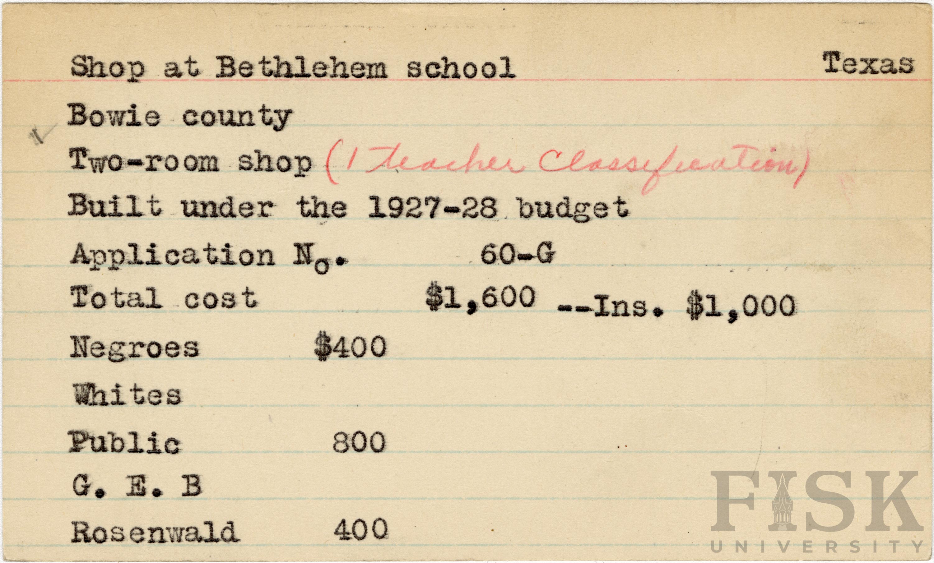 - School card from Rosenwald Fund for the two room shop at Bethlehem School in Bowie County, Texas with a section added to the budget contribution sections that says, "Ins. $1,000"