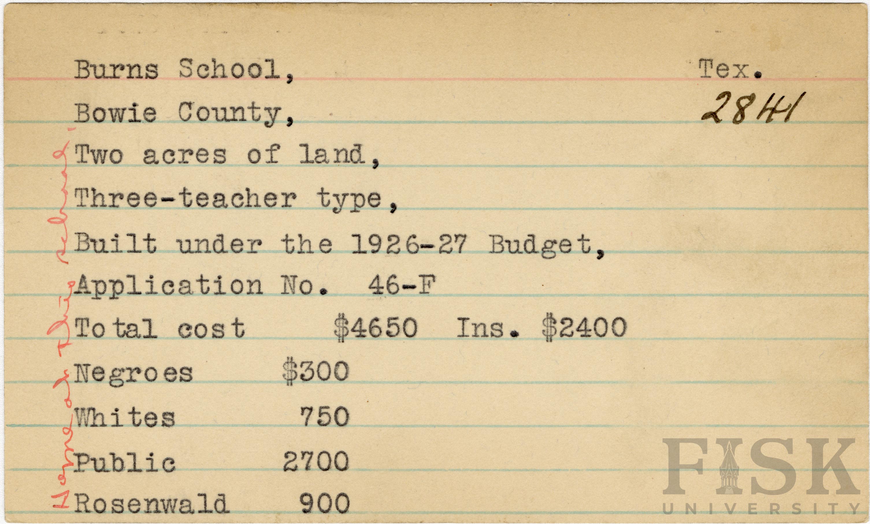 School card from Rosenwald Fund for Burns School in Bowie County, Texas with a section added to the budget contributions that says, "Ins. $2,400" and a note on the card says, "home at this school"