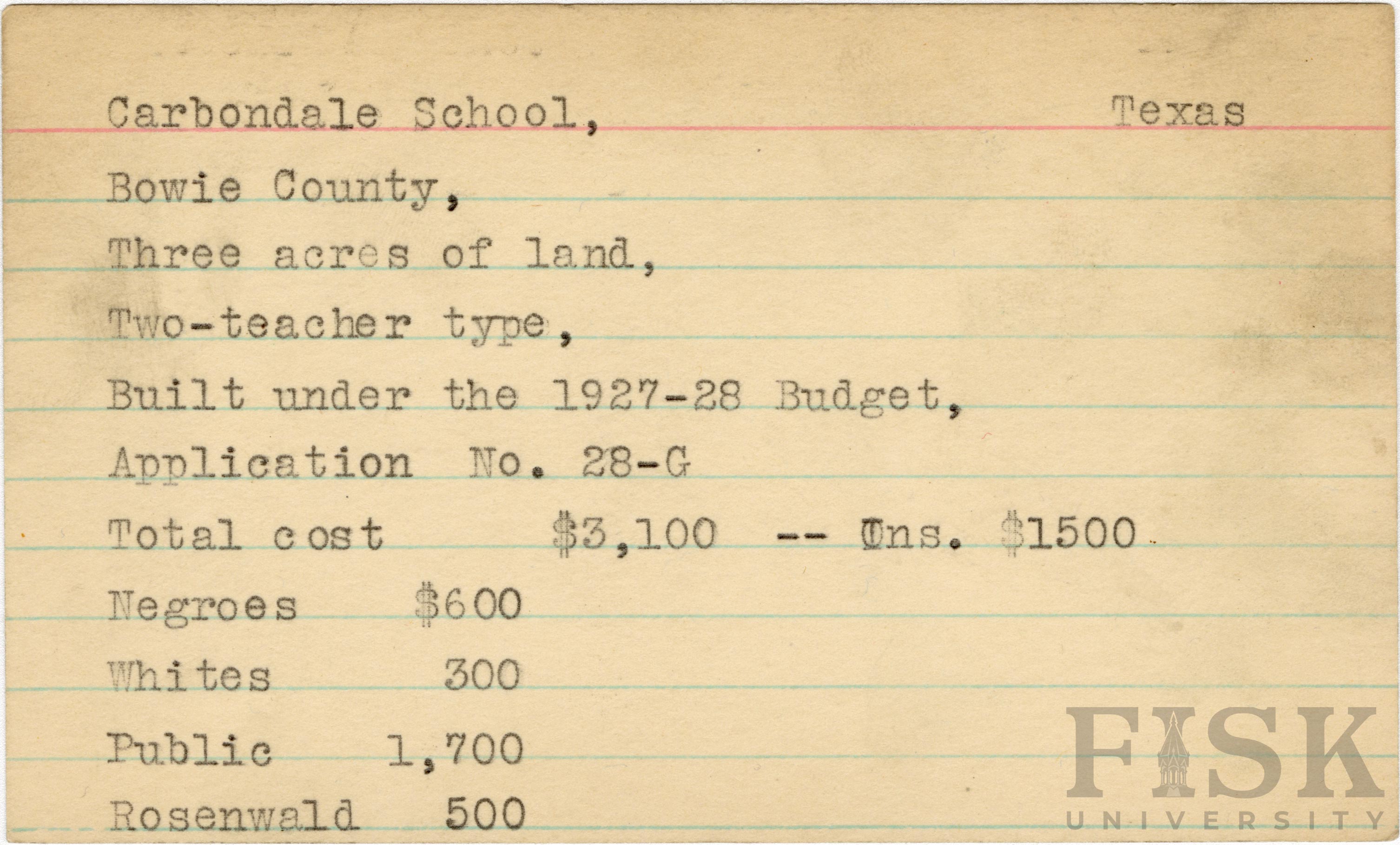 - School card from Rosenwald Fund for Carbondale School in Bowie County, Texas with a section added to the budget contributions that says, "Ins. $1,500"