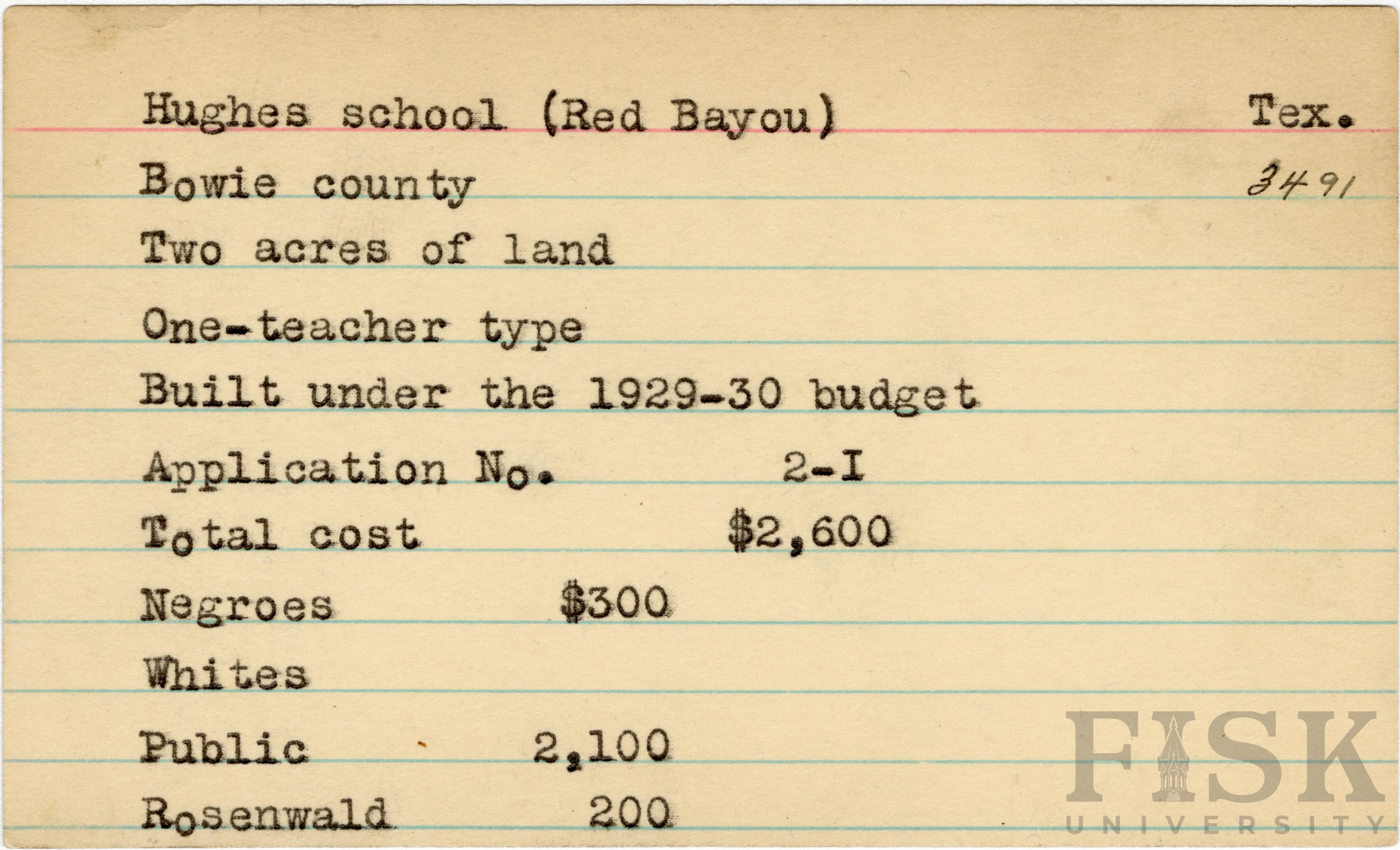 - School card from Rosenwald Fund for Hughes School in Bowie County, Texas