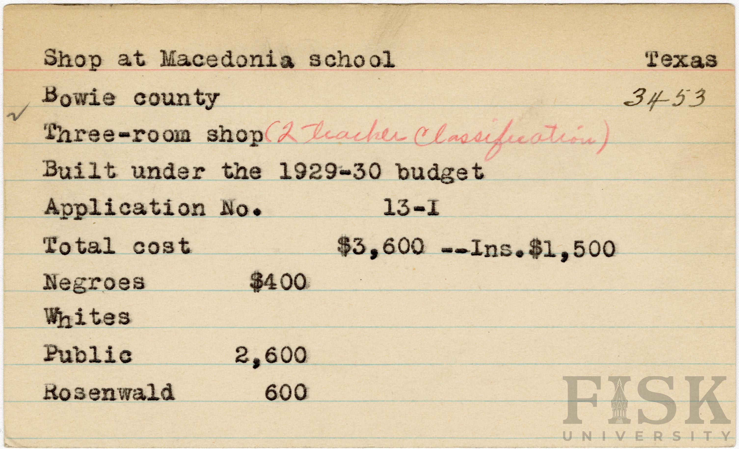 School card from Rosenwald Fund for the three room shop at Macedonia School in Bowie County, Texas with a section added to the budget contributions that says, "Ins. $1,500"