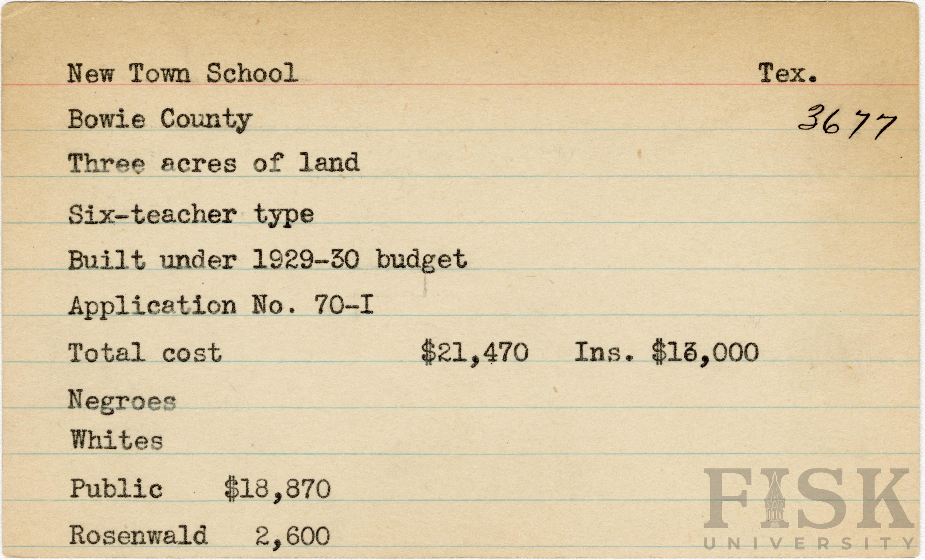 - School card from Rosenwald Fund for New Town School in Bowie County, Texas with a section added to the budget contributions that says, "Ins. $13,000"