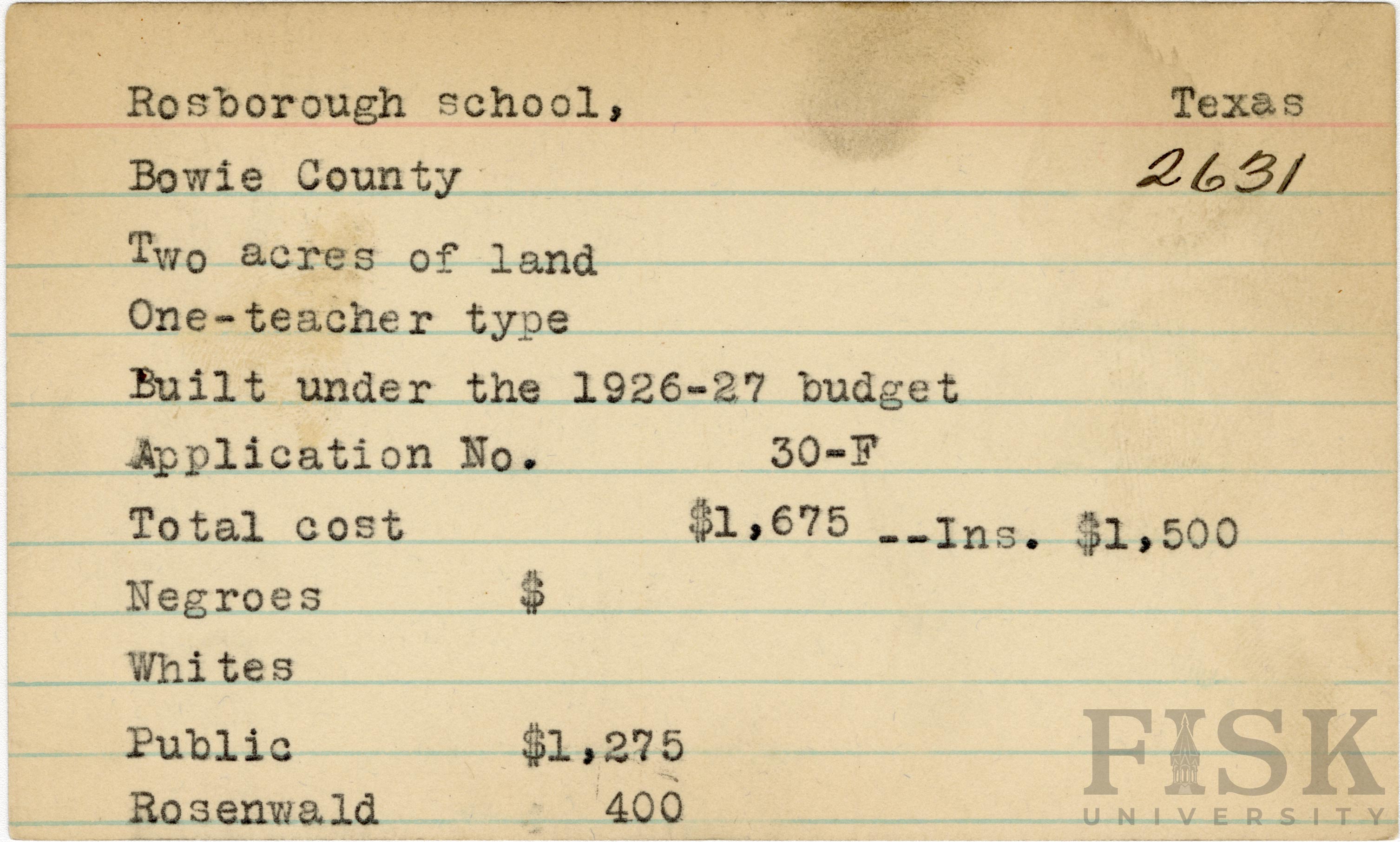 - School card from Rosenwald Fund for Rosborough School in Bowie County, Texas with a section added to the budget contributions that says, "Ins. $1,500"