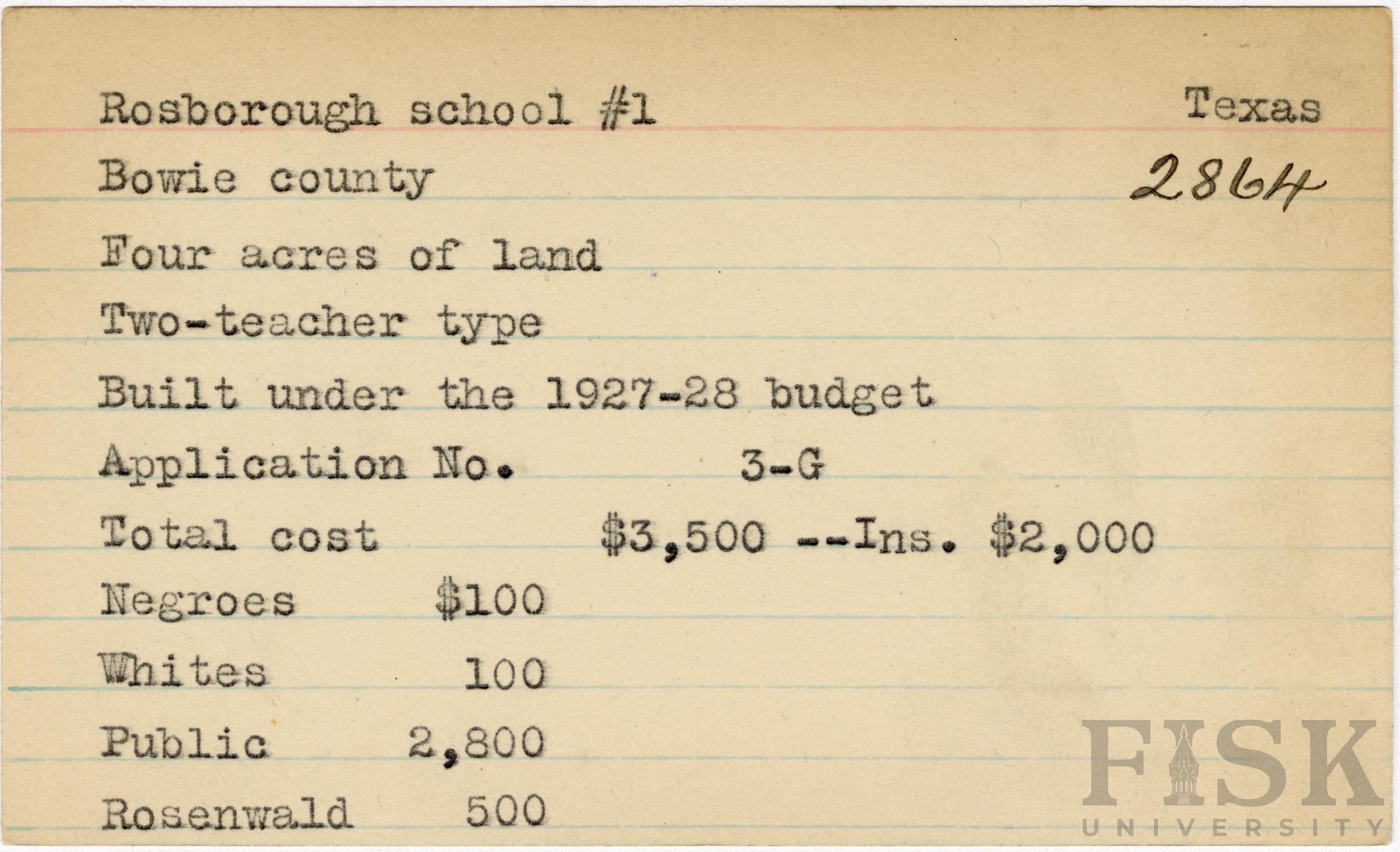 - School card from Rosenwald Fund for Rosborough School No. 1 in Bowie County, Texas with a section added to the budget contributions that says, "Ins. $2,000"