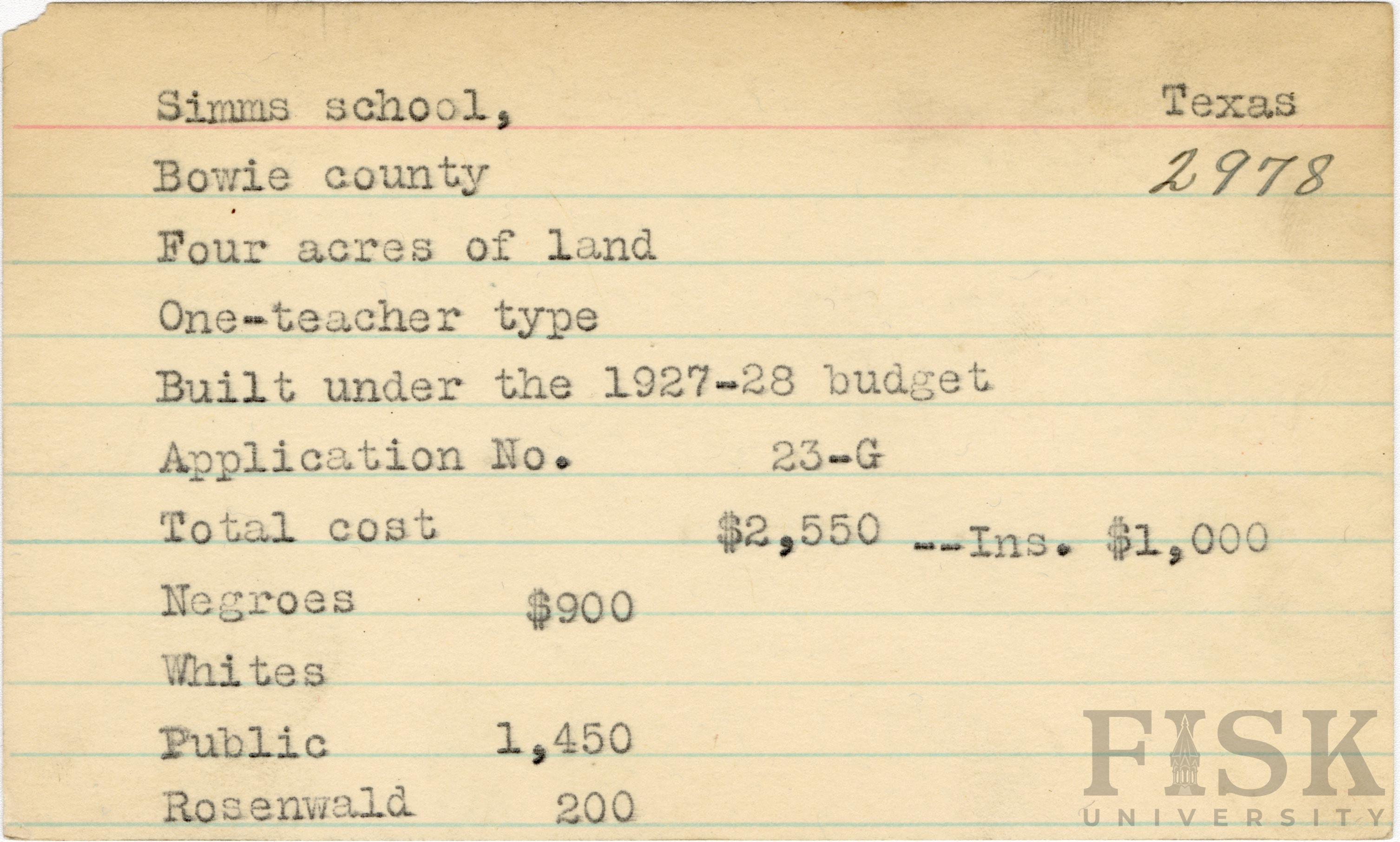School card from Rosenwald Fund for Simms School in Bowie County, Texas with a section added to the budget contributions that says, "Ins. $1,000"