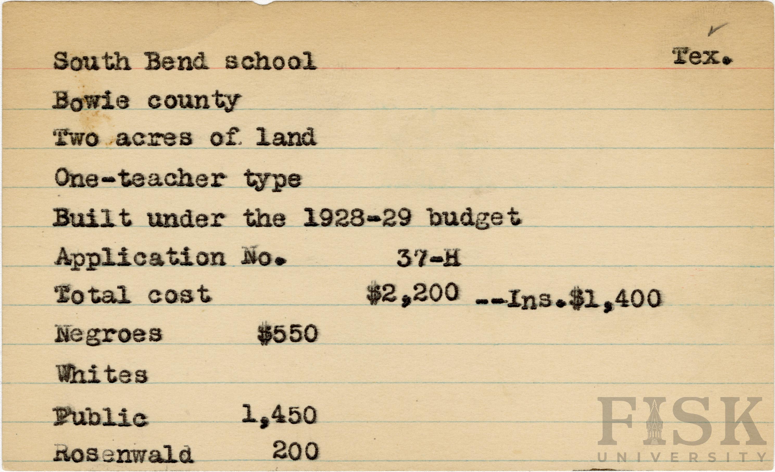 - School card from Rosenwald Fund for South Bend School in Bowie County, Texas with a section added to the budget contributions that says, "Ins. $1,400"