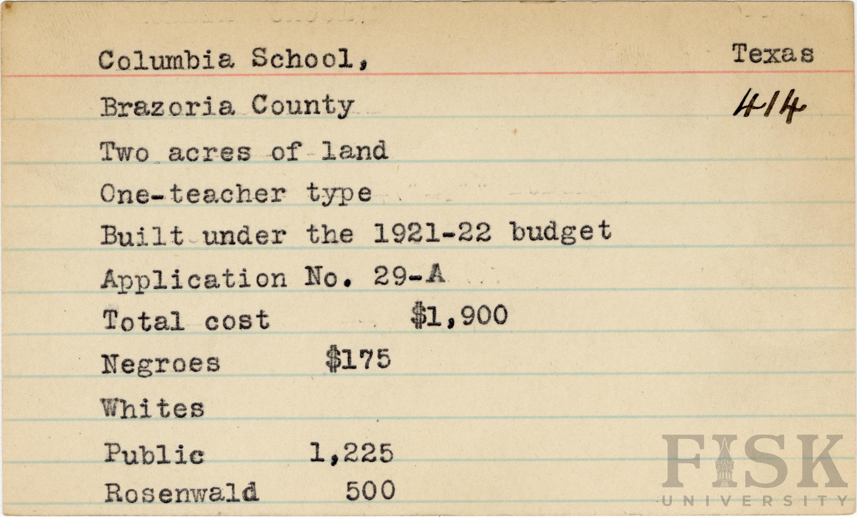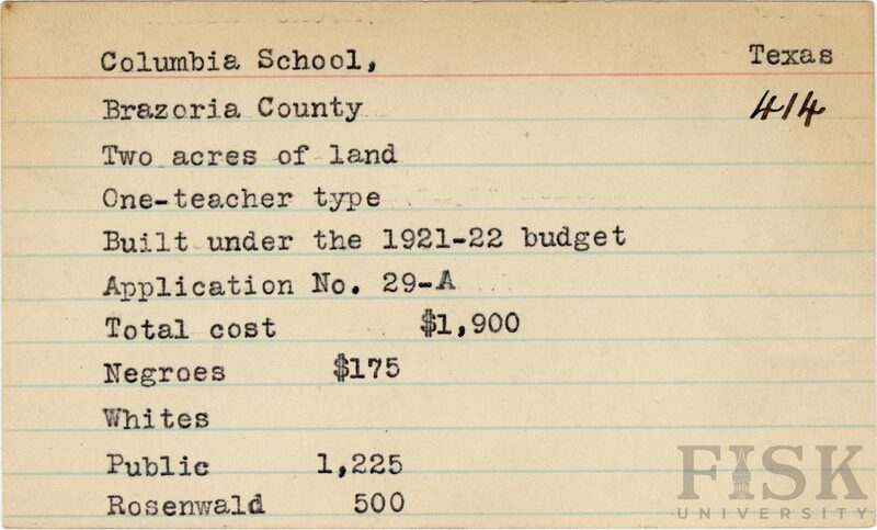 - School card from Rosenwald Fund for Columbia School in Brazoria County, Texas