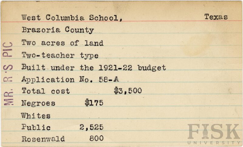 - School card from Rosenwald Fund for West Columbia School in Brazoria County, Texas with a note on the card that says, "Mr. R's Pic"