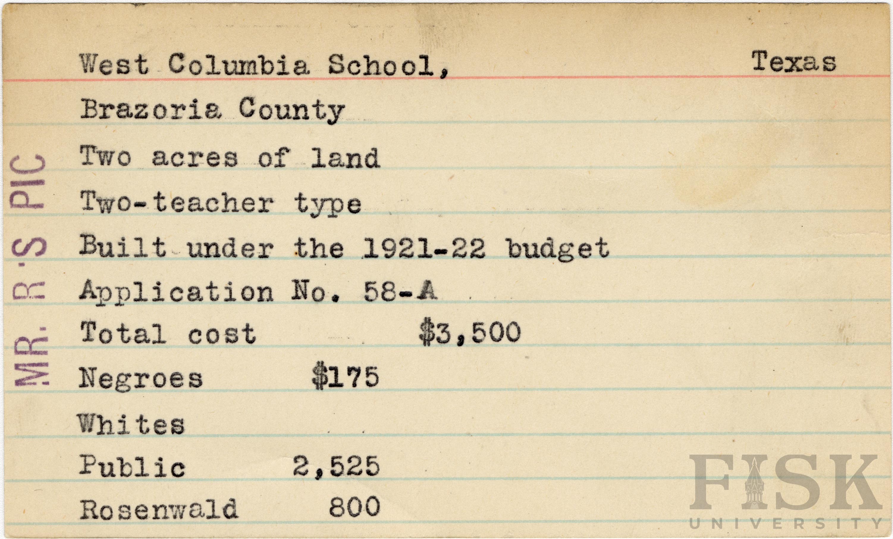 School card from Rosenwald Fund for West Columbia School in Brazoria County, Texas with a note on the card that says, "Mr. R's Pic"