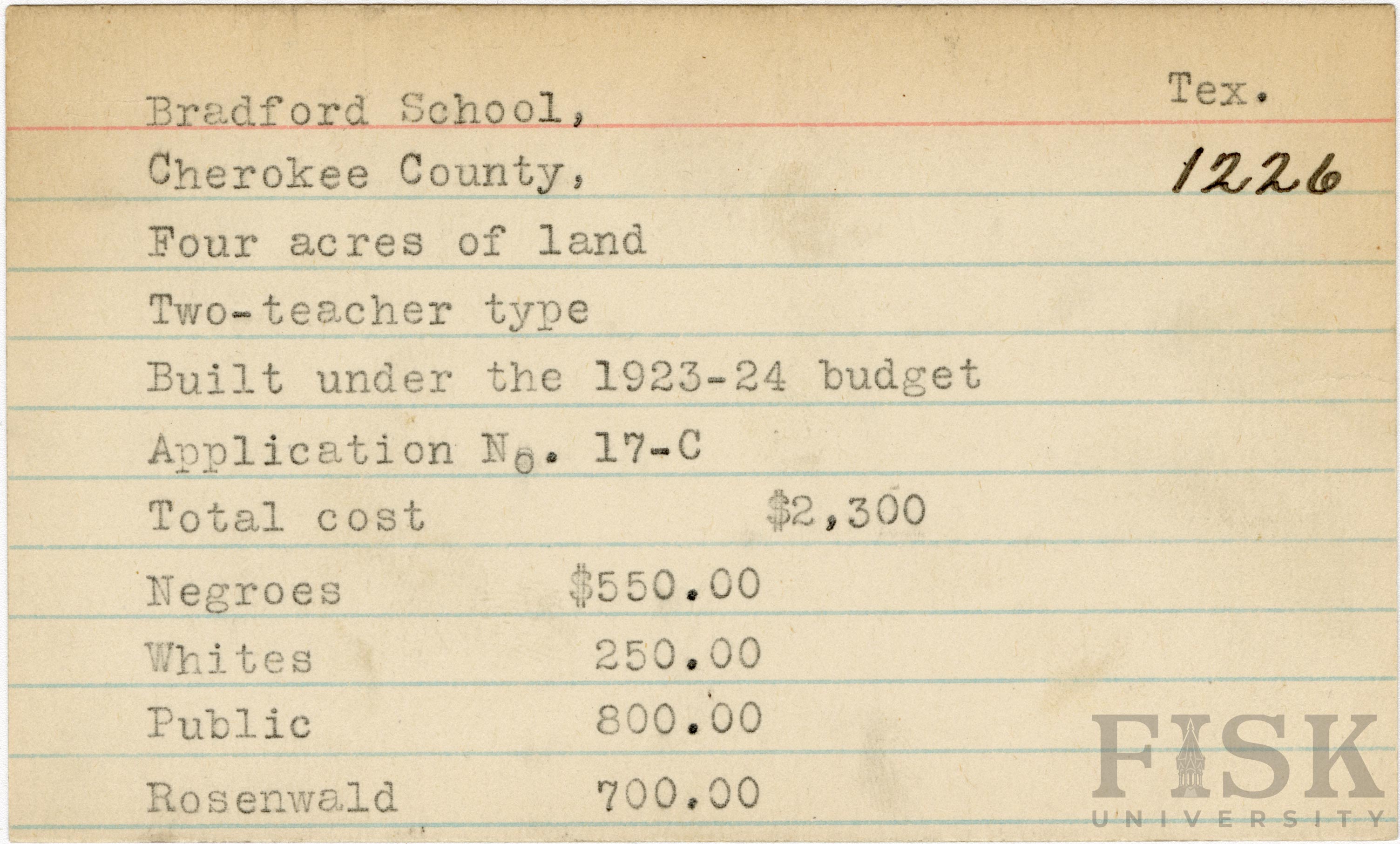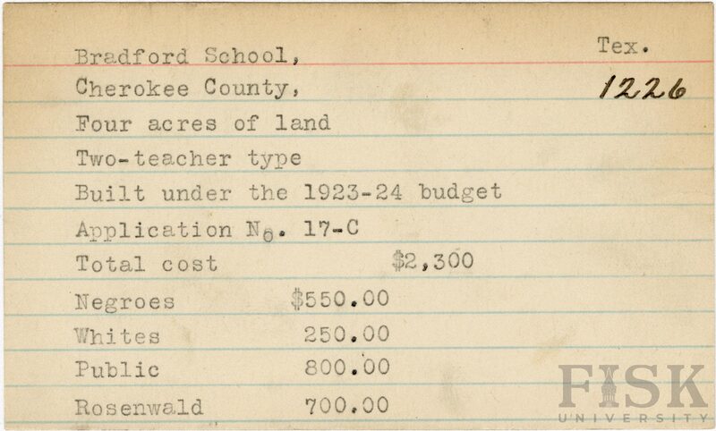 - School card from Rosenwald Fund for Bradford School in Cherokee County, Texas