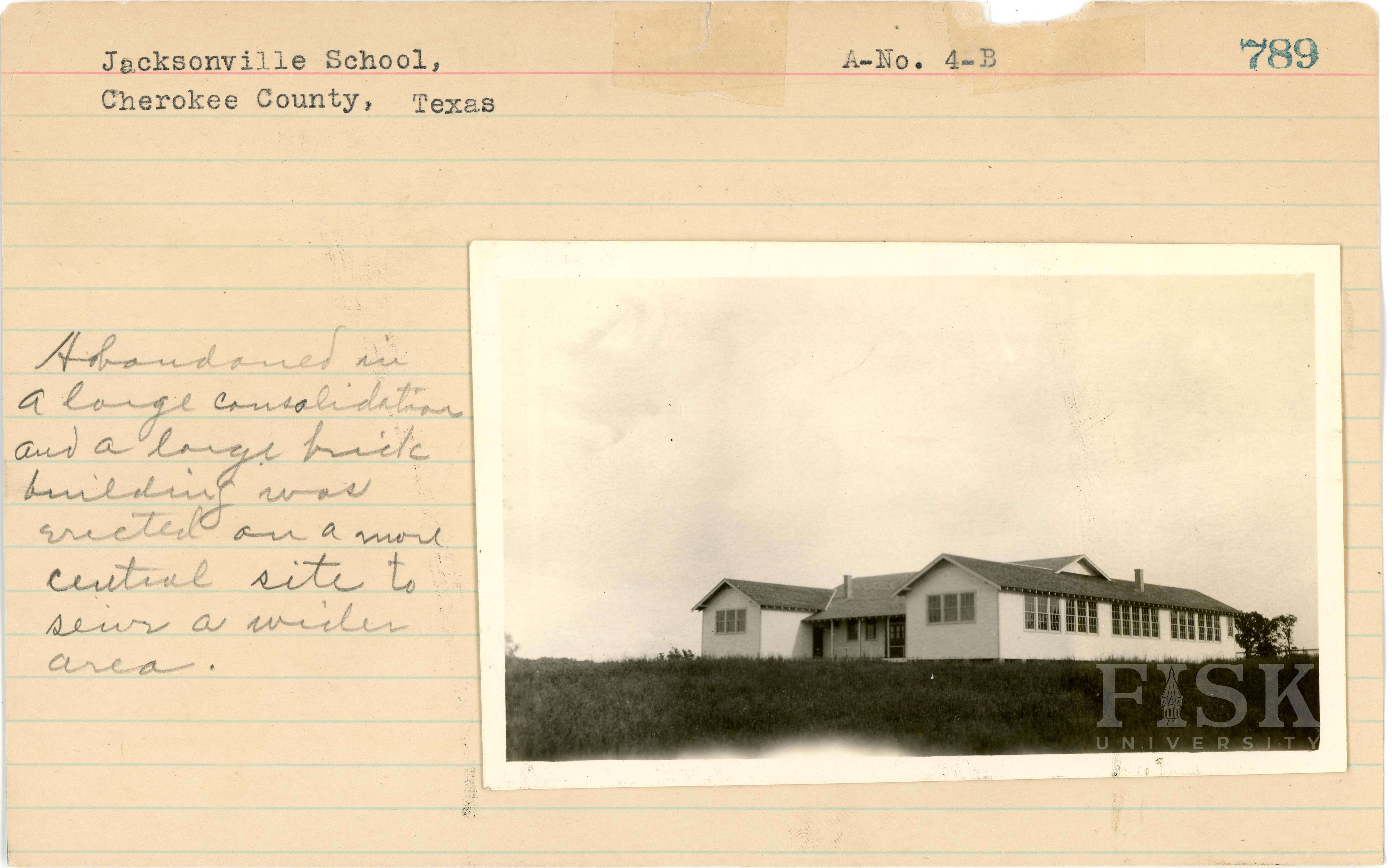 - Photo of Jacksonville School in Cherokee County, Texas with a note on the card that says, "Abandoned in a large consolidation and a large [unclear] building was erected on a more central site to serve a wider area"
