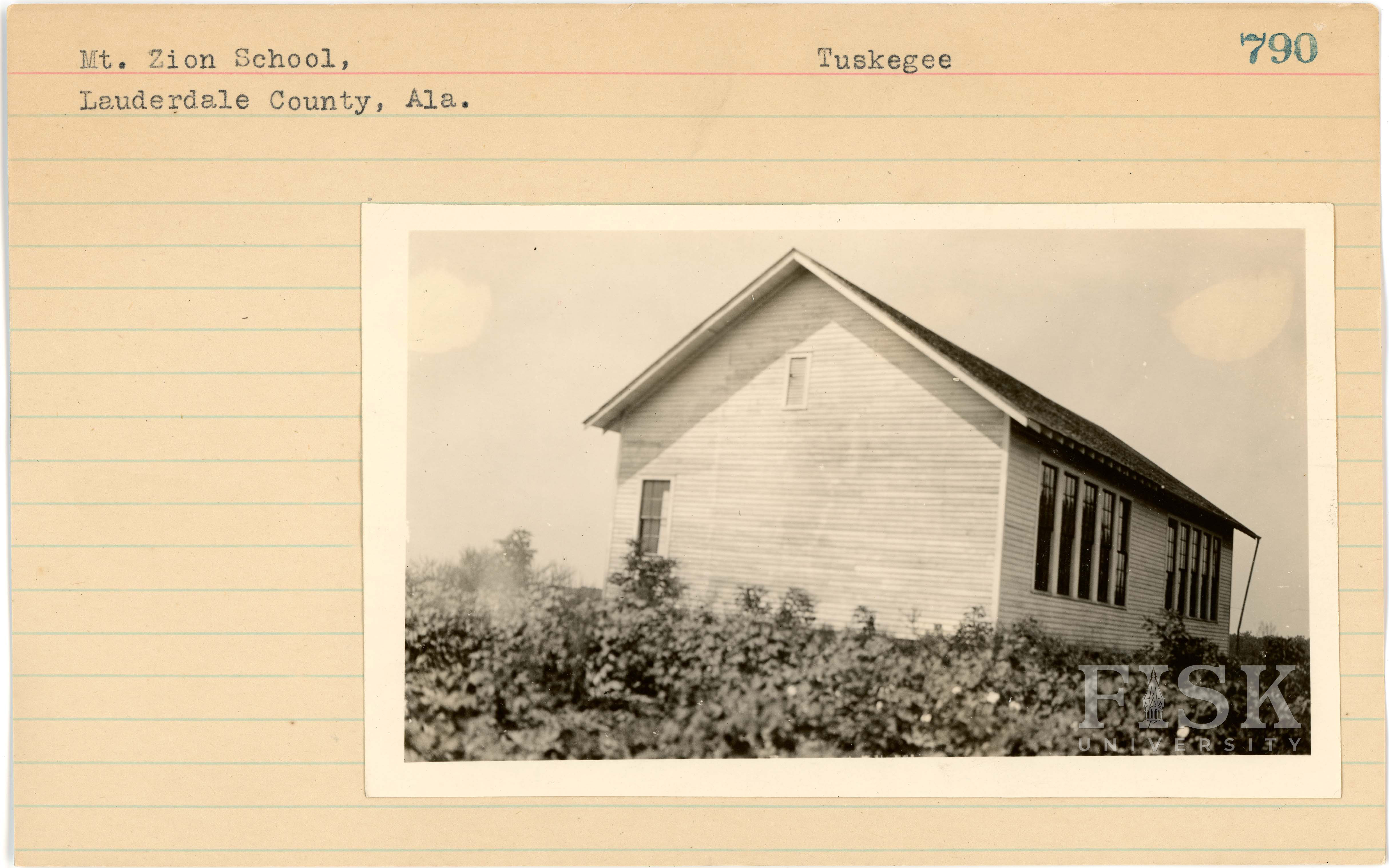 - Photo of Mt. Zion School in Lauderdale County, Alabama with a note on the card that says, "Tuskegee"