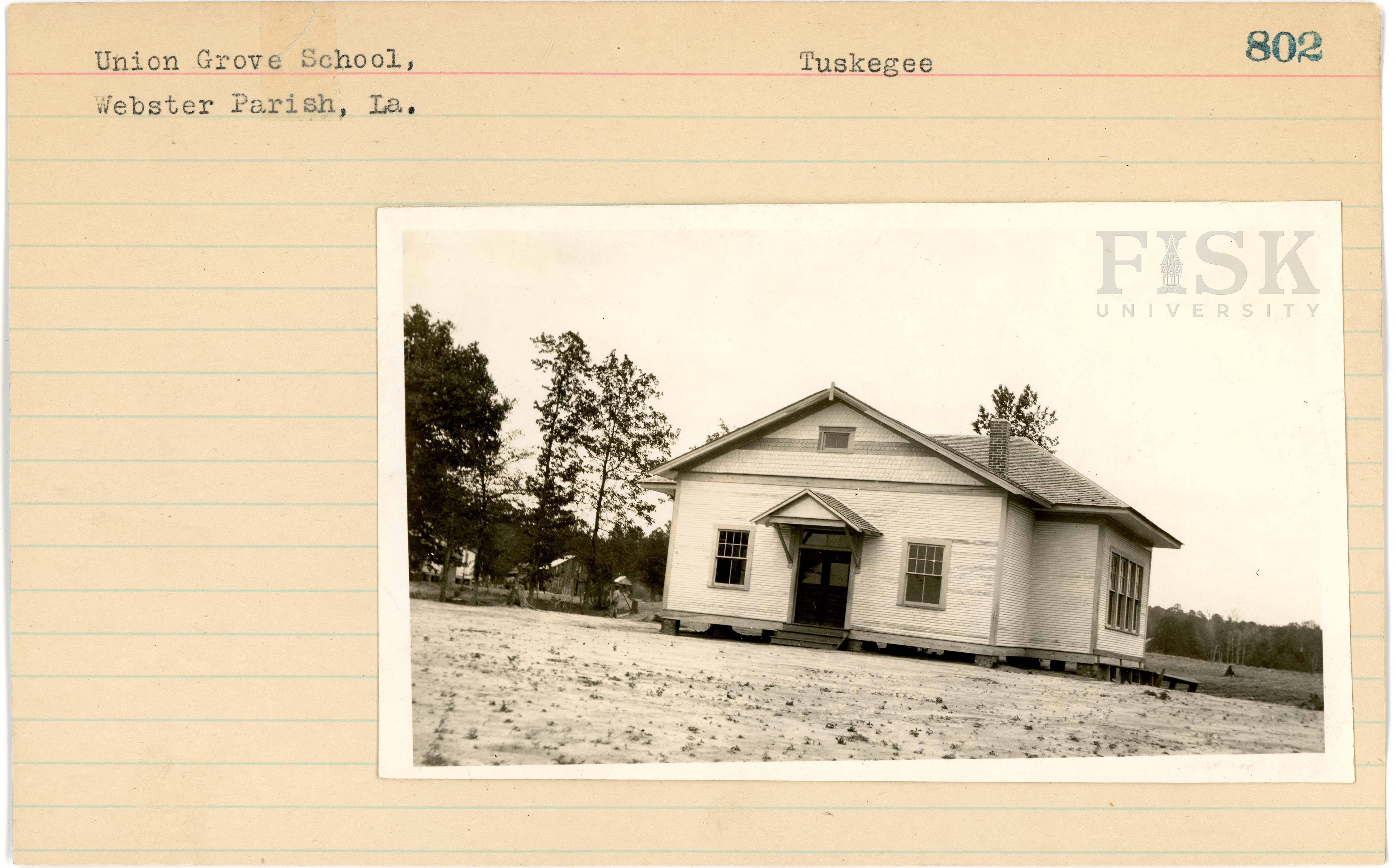 - Photo of Union Grove School in Webster Parish, Louisiana with a note on the card that says, "Tuskegee"