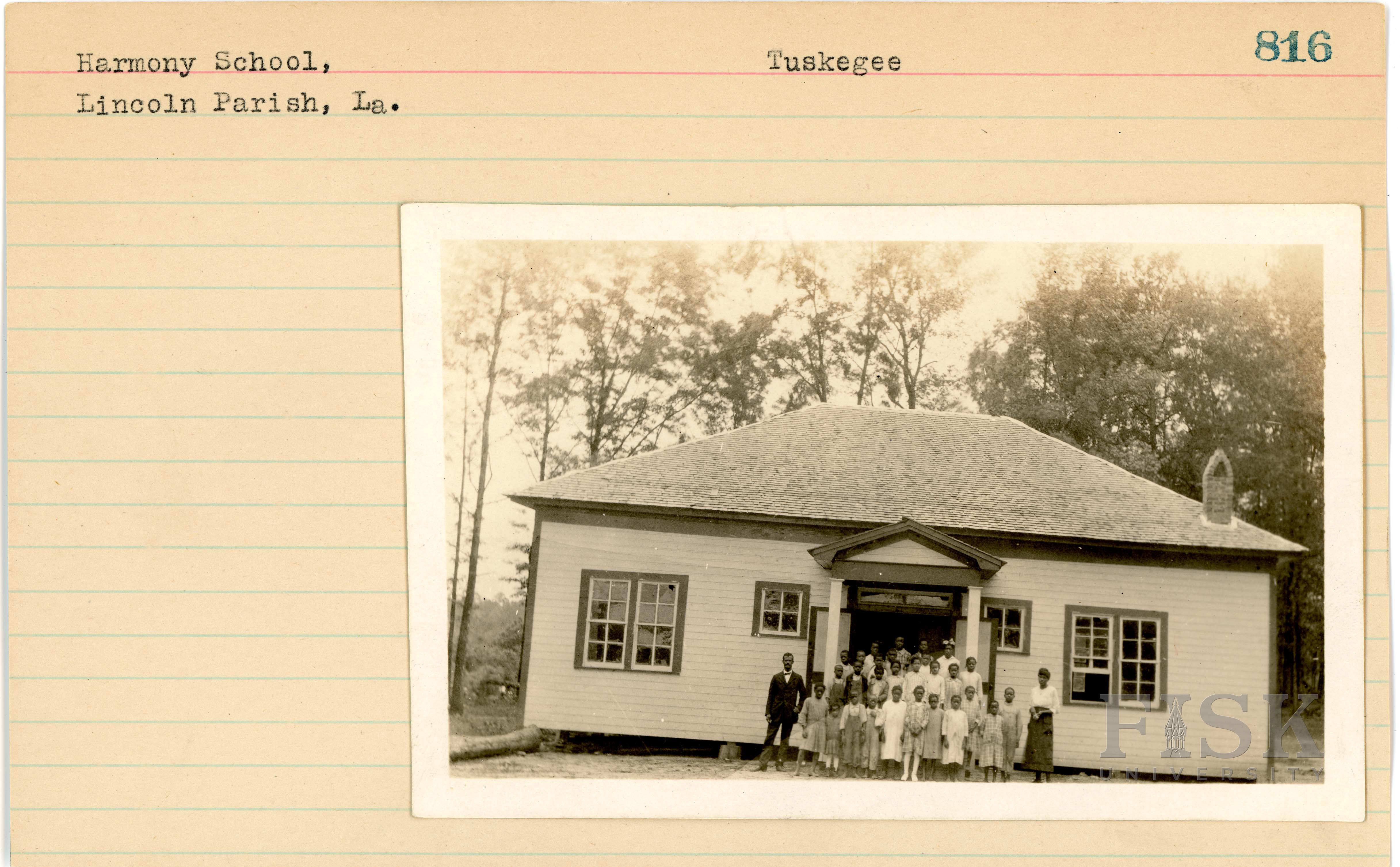 - Photo of Harmony School in Lincoln Parish, Louisiana with a note on the card that says, "Tuskegee". Pupils are standing outside the schoolhouse in the photo.