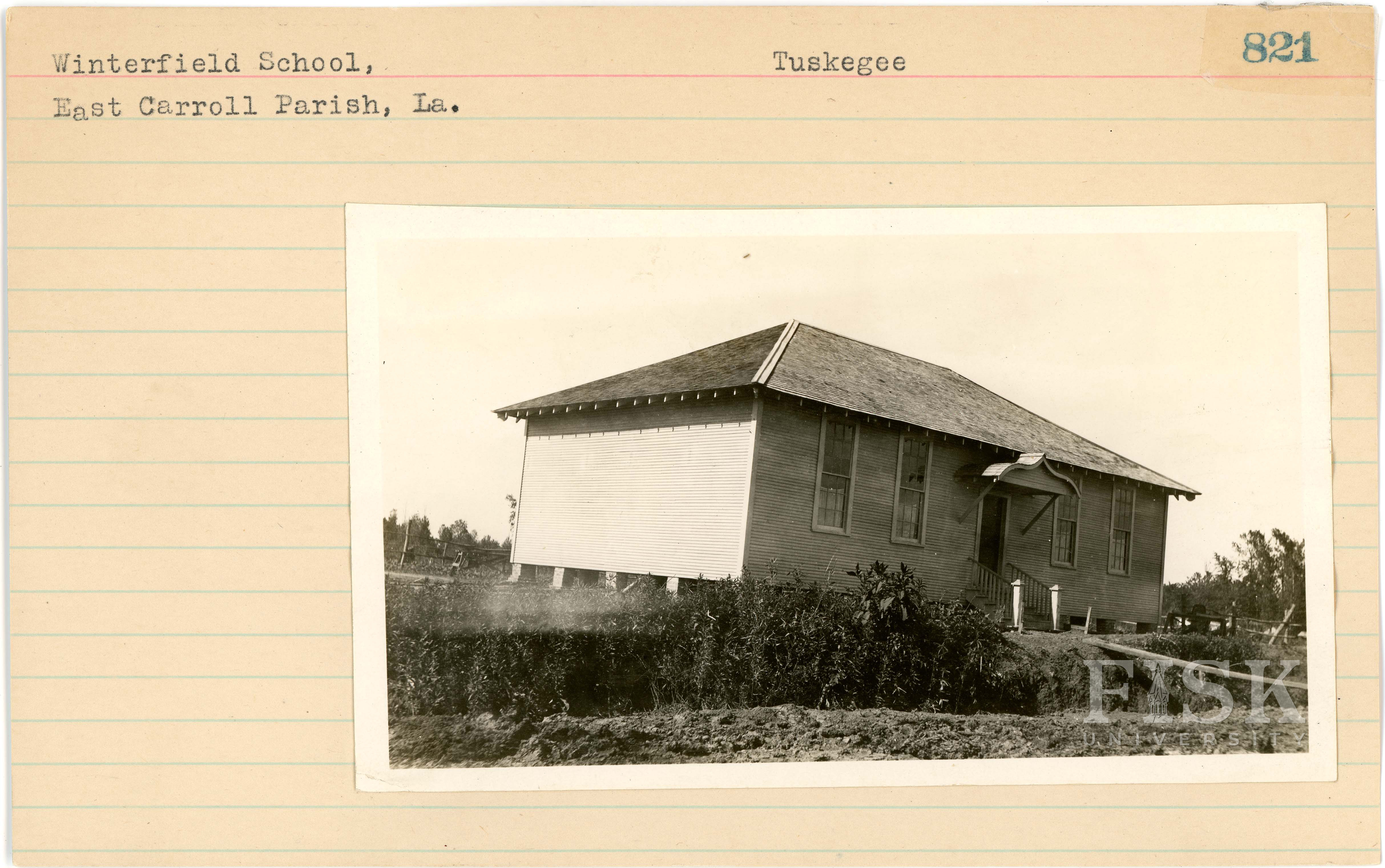- Photo of Winterfield School in East Carroll Parish, Louisiana with a note on the card that says, "Tuskegee"