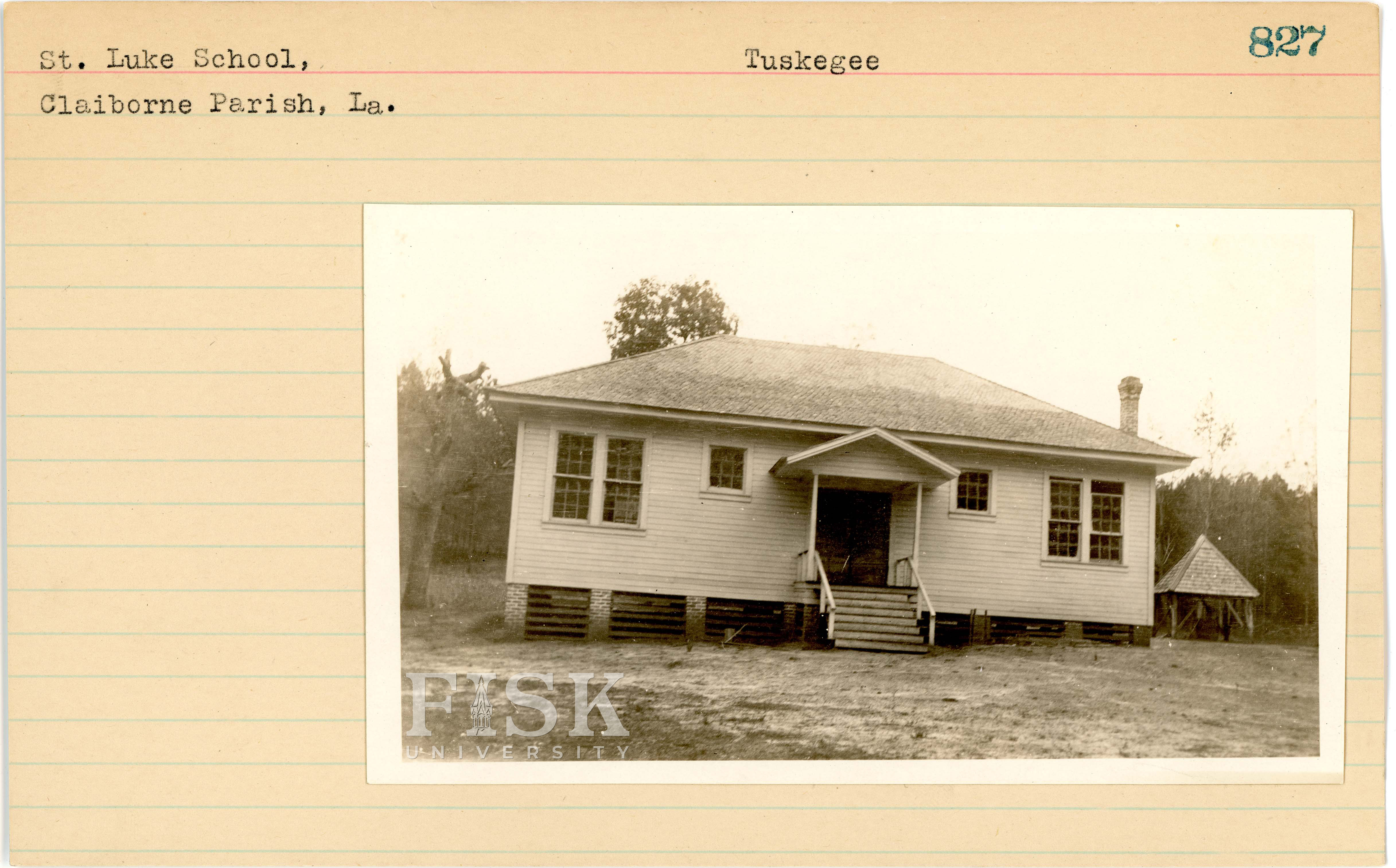 - Photo of St. Luke School in Claiborne Parish, Louisiana with a note on the card that says, "Tuskegee"