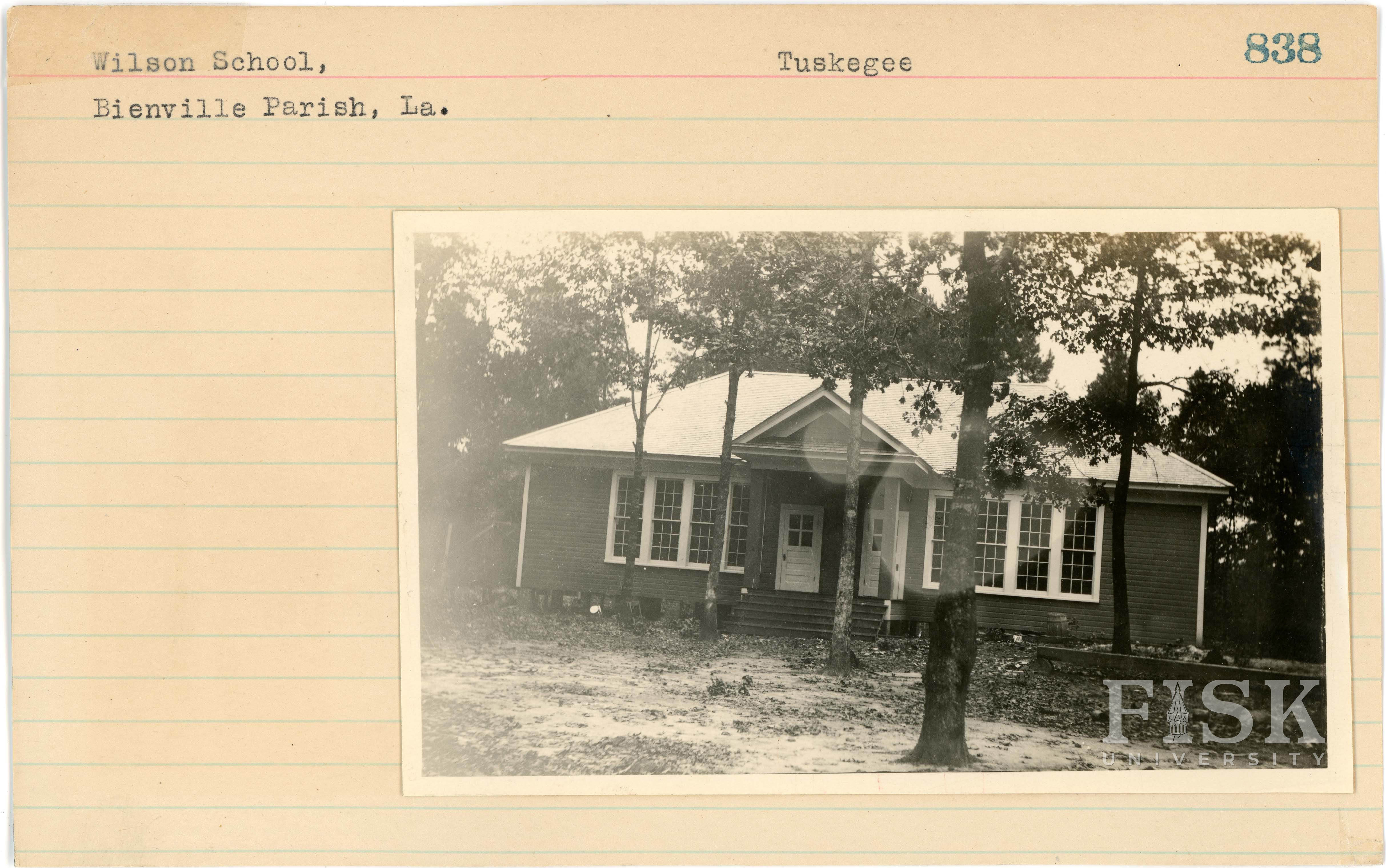 - Photo of Wilson School in Bienville Parish, Louisiana with a note on the card that says, "Tuskegee"
