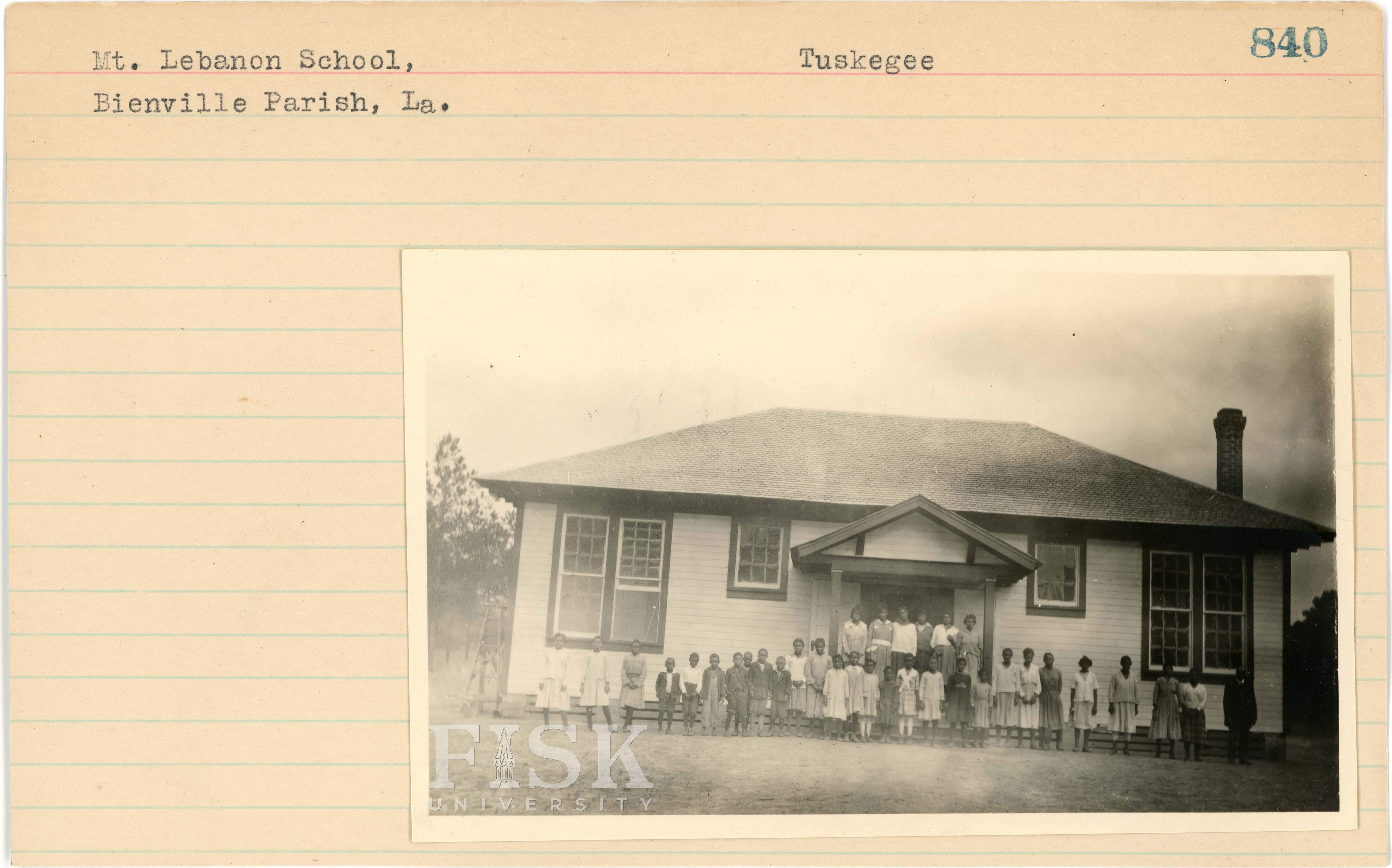 - Photo of Mt. Lebanon School in Bienville Parish, Louisiana with a note on the card that says, "Tuskegee"
