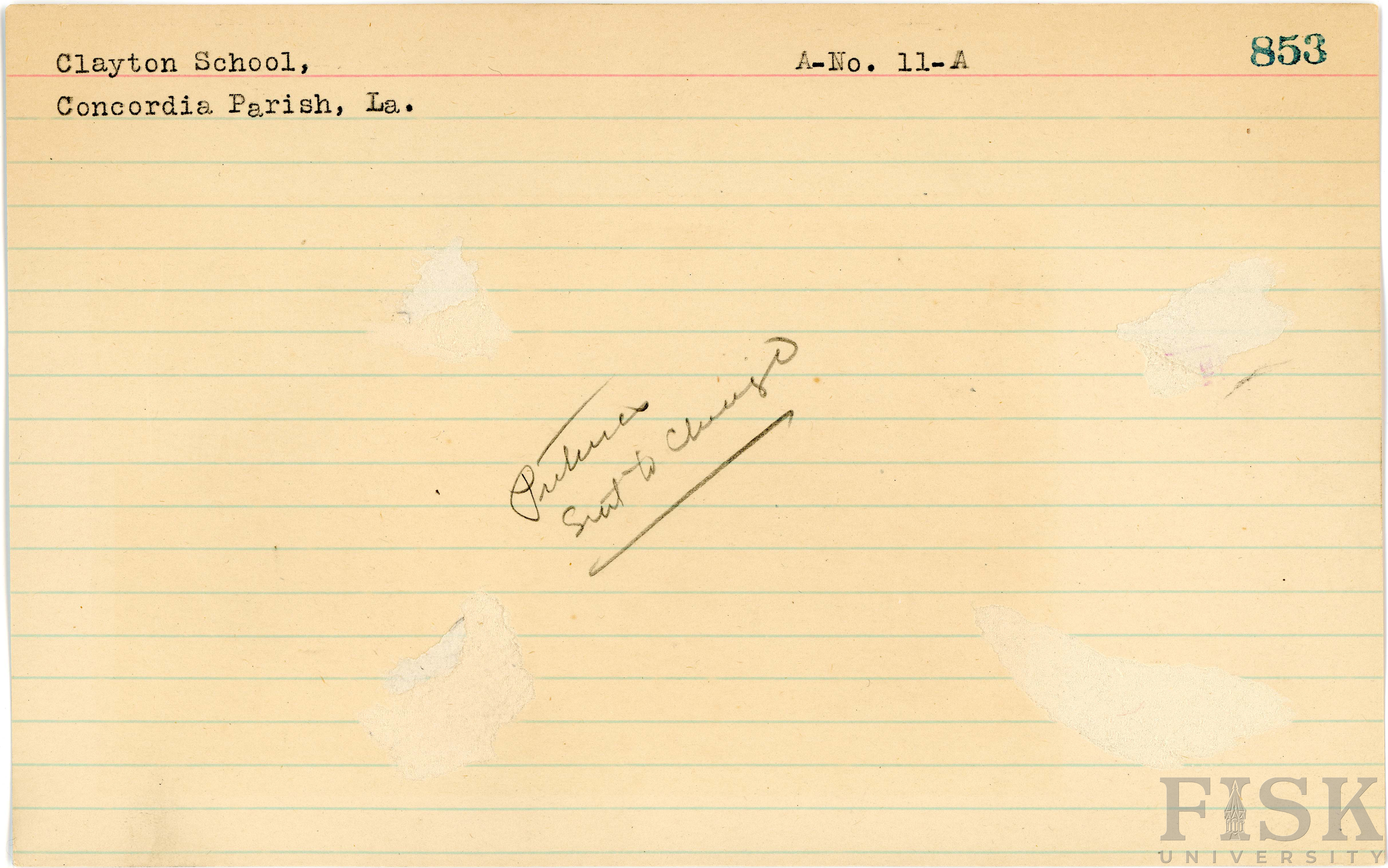- School card for Clayton School in Concordia Parish, Louisiana with no photo attached. A note on the card says, "Pictures sent to [unclear]"