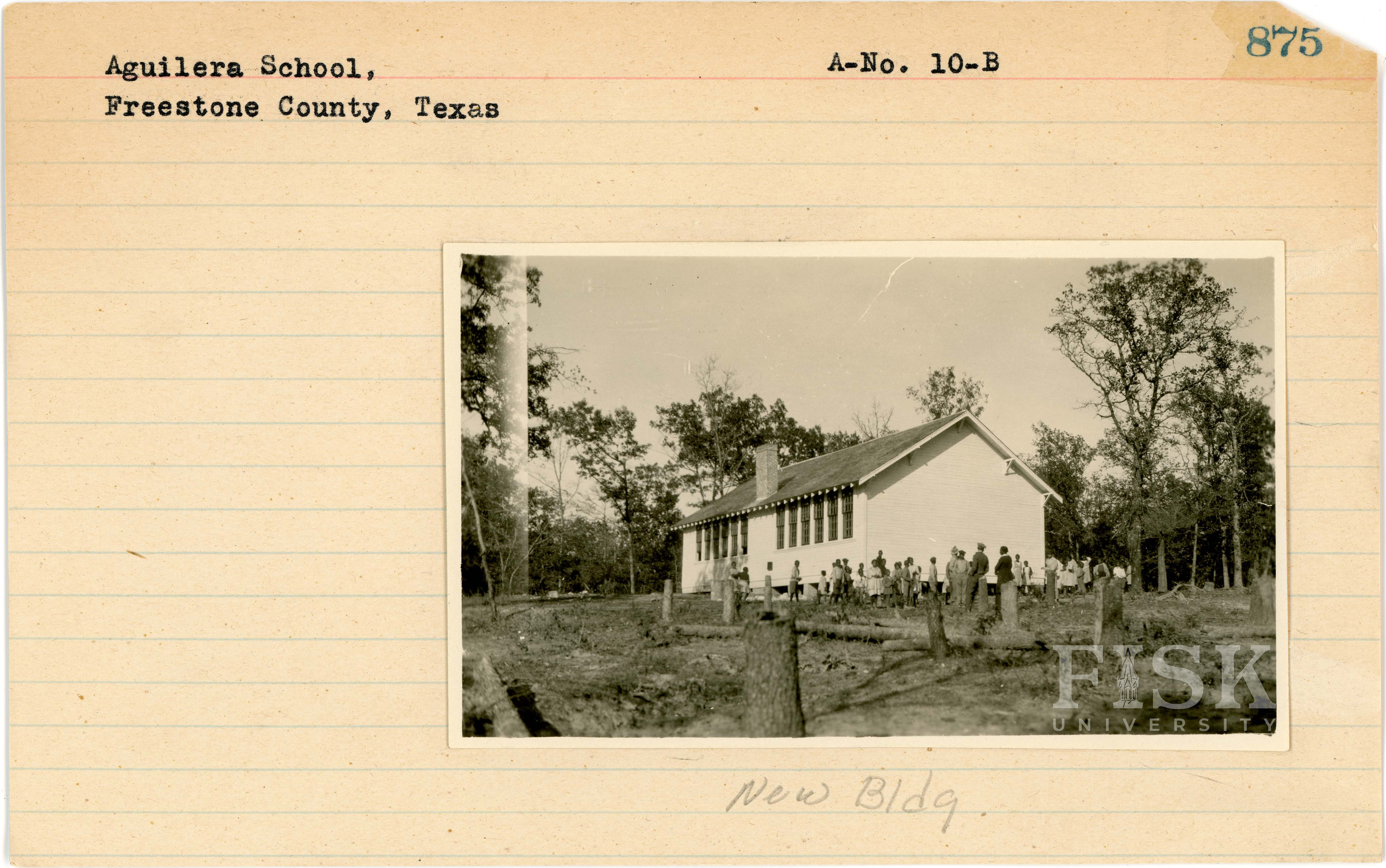 - Photo of Aguilera School in Freestone County, Texas with a note on the front card that says, "New Bldg" and a note on the back card that says, "Old Bldg"