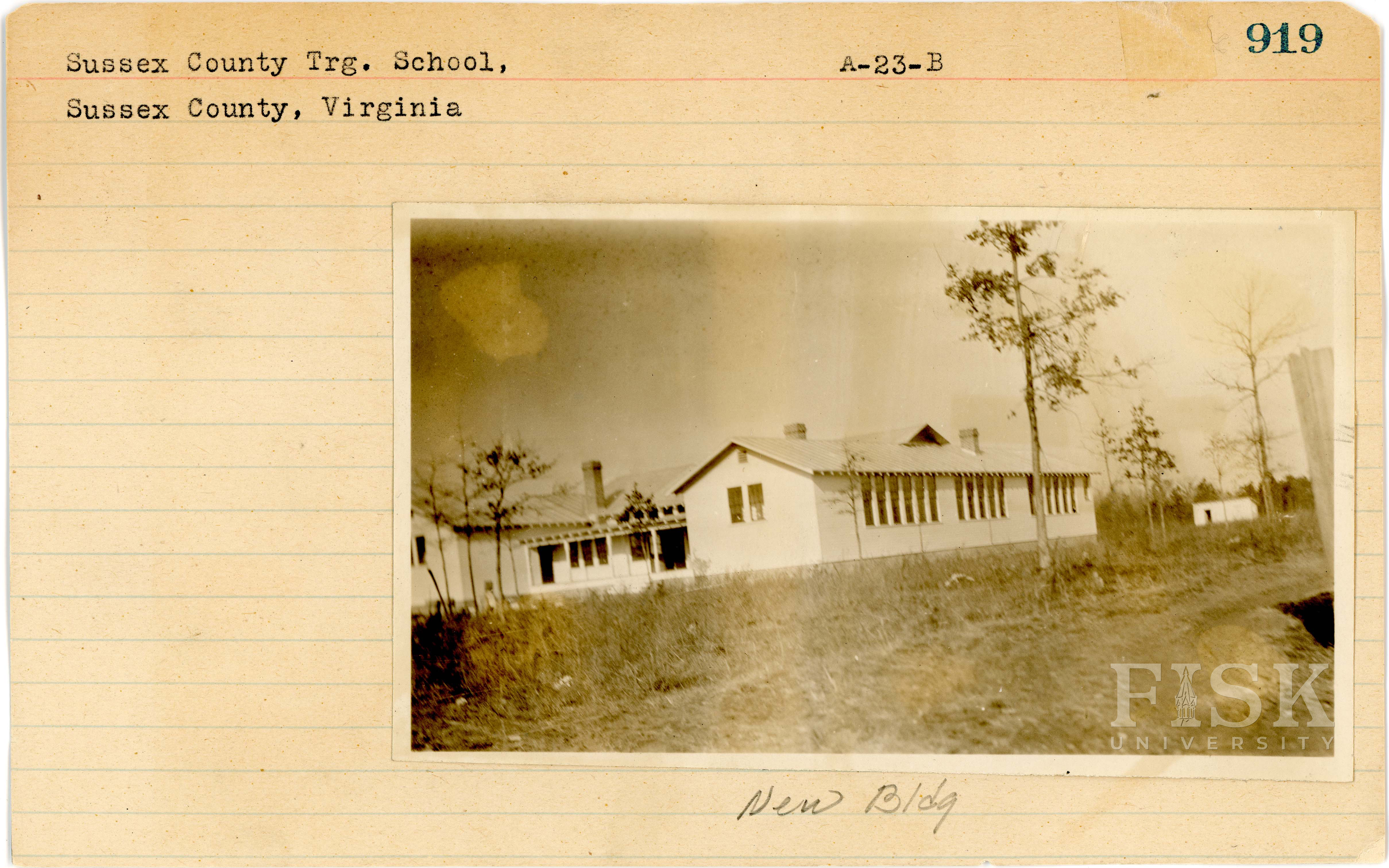 - Photos of County Training School in Sussex County, Virginia with a note on the front card that says, "New Bldg" and a note on the card that says, "Old Bldgs"