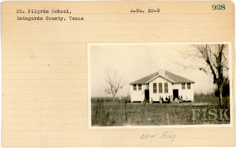 - Photos of Mt. Pilgrim School in Matagorda County, Texas with a note on the front card that says, "New Bldg" and a note on the back card that says, "Old Bldg"