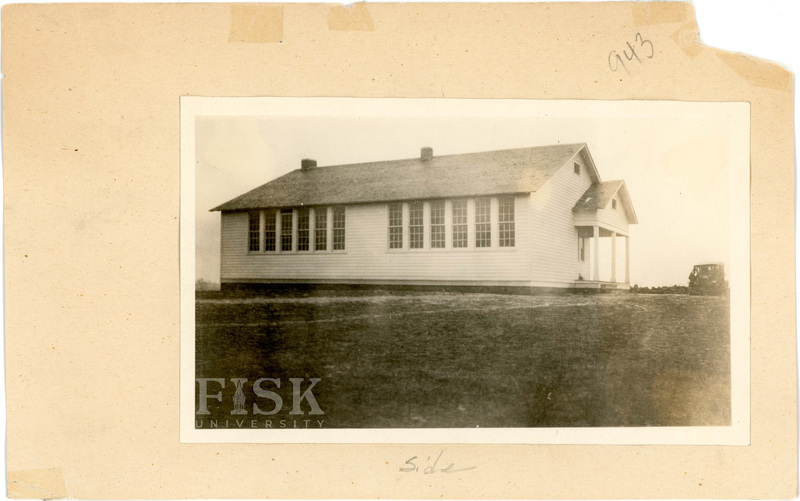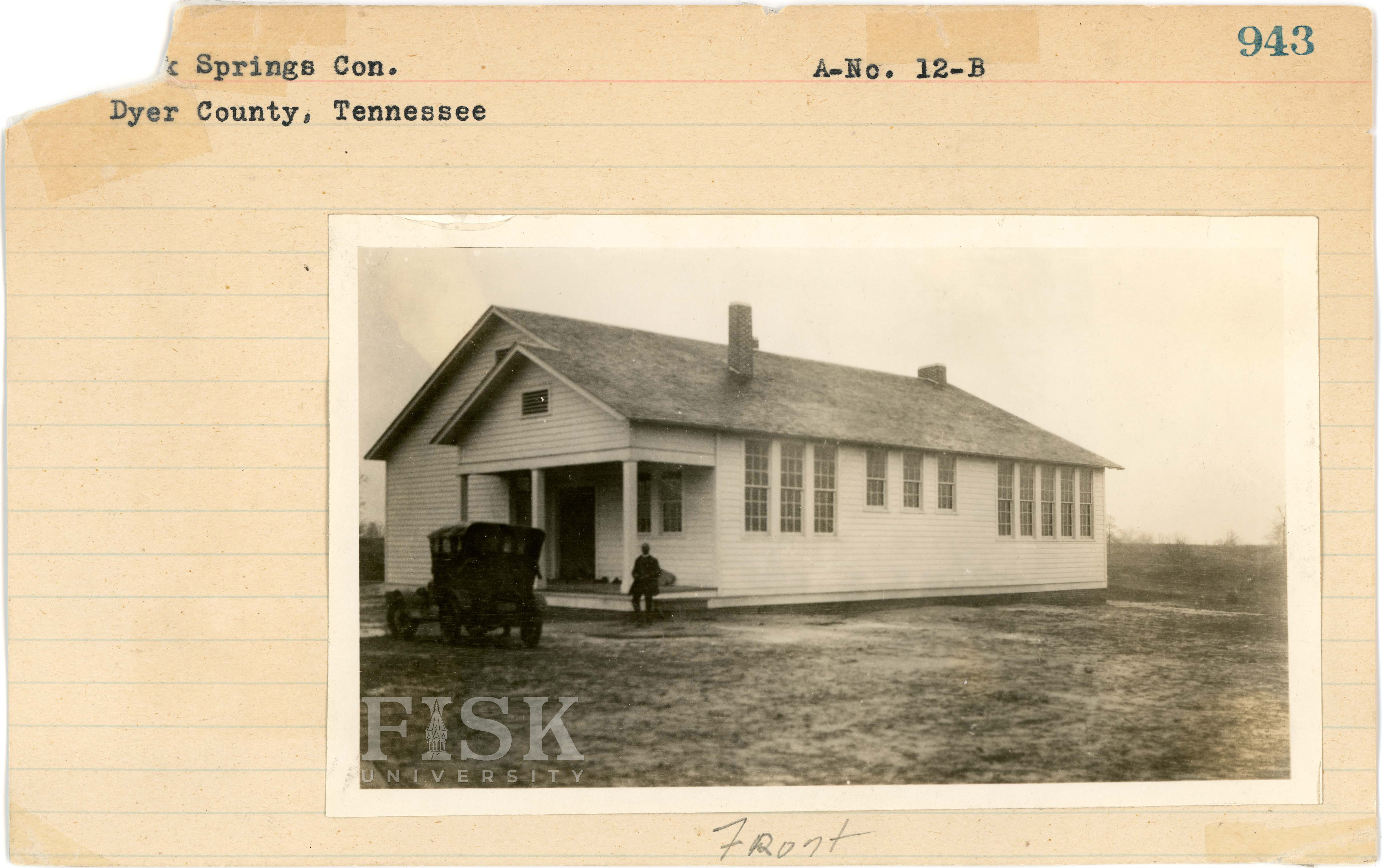 - Photo of Rock Springs Consolidated School in Dyer County, Tennessee with a note on the front card that says, "Front" and a note on the back card that says, "Side"