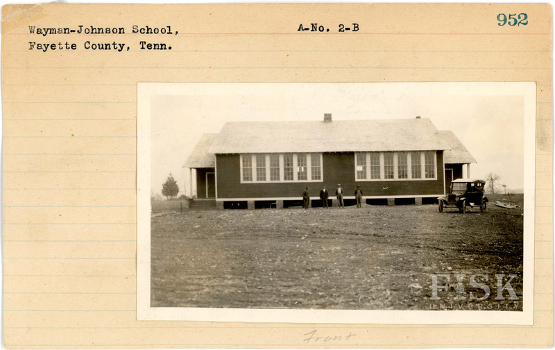 - Photo of Wayman-Johnson School in Fayette County, Tennessee with a note on the front card that says, "slide" and a note on the back card that says, "Front"
