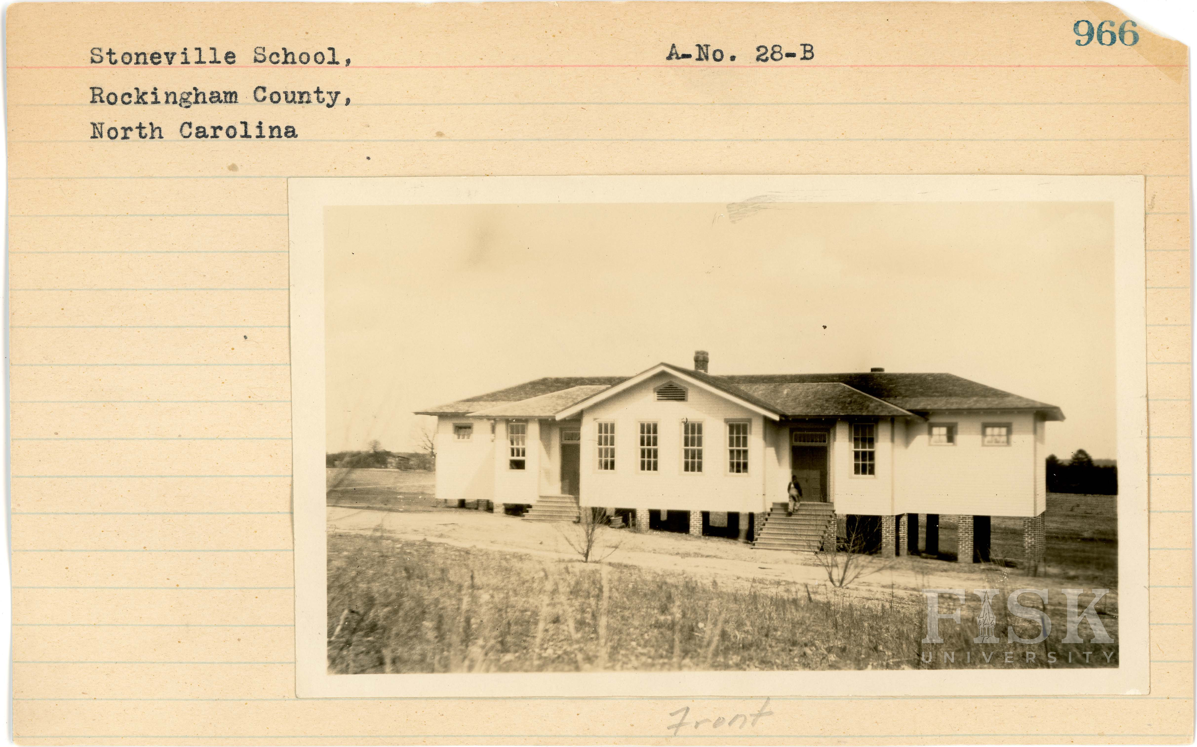 Photo of Stoneville School in Rockingham County, North Carolina with a note on the front card that says, "Front" and a note on the back card that says, "Back"