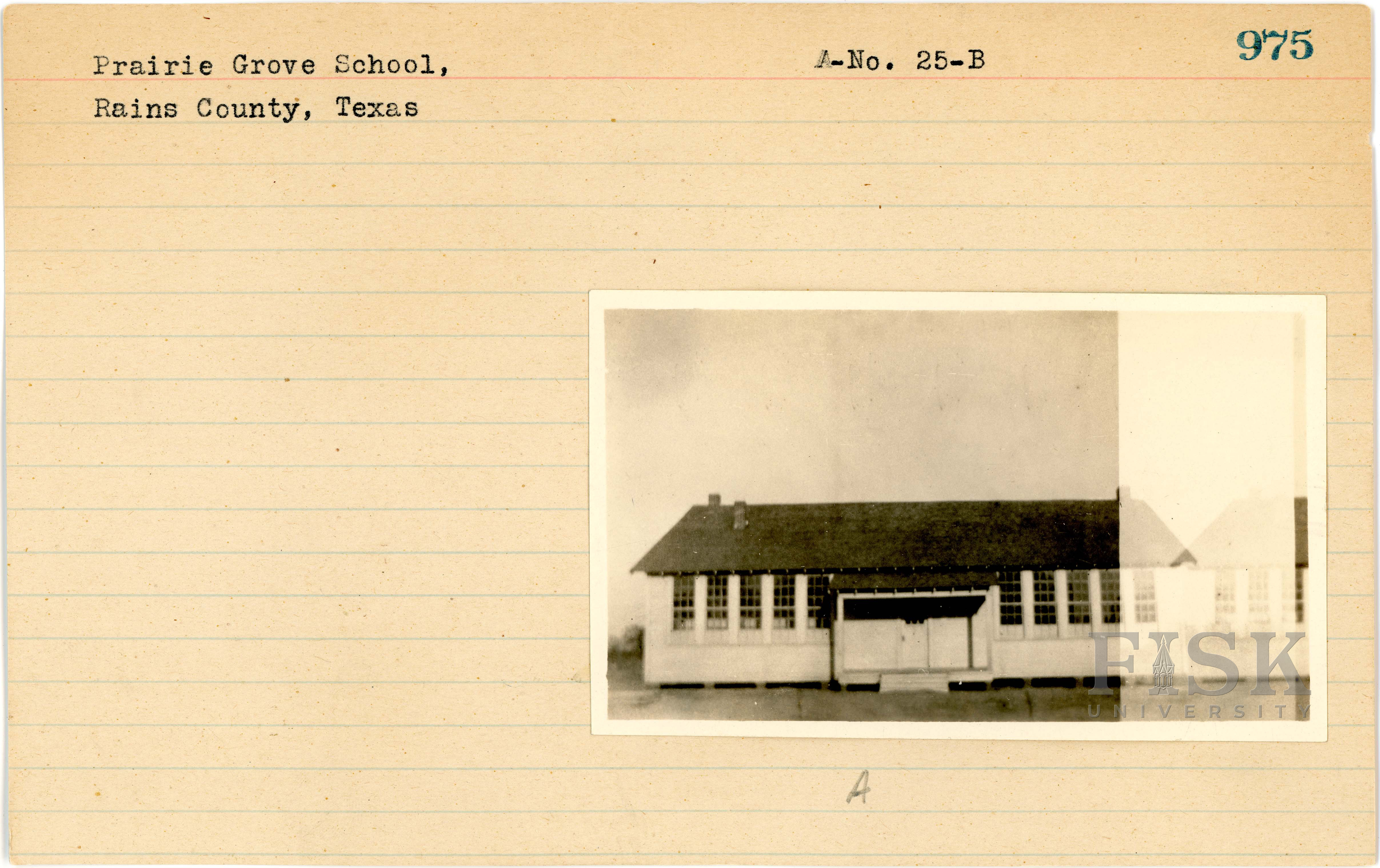 - Photos of Prairie Grove School in Rains County, Texas with a letter on the front card that says, "A" and two photos on the back card with letters "B" and "C"