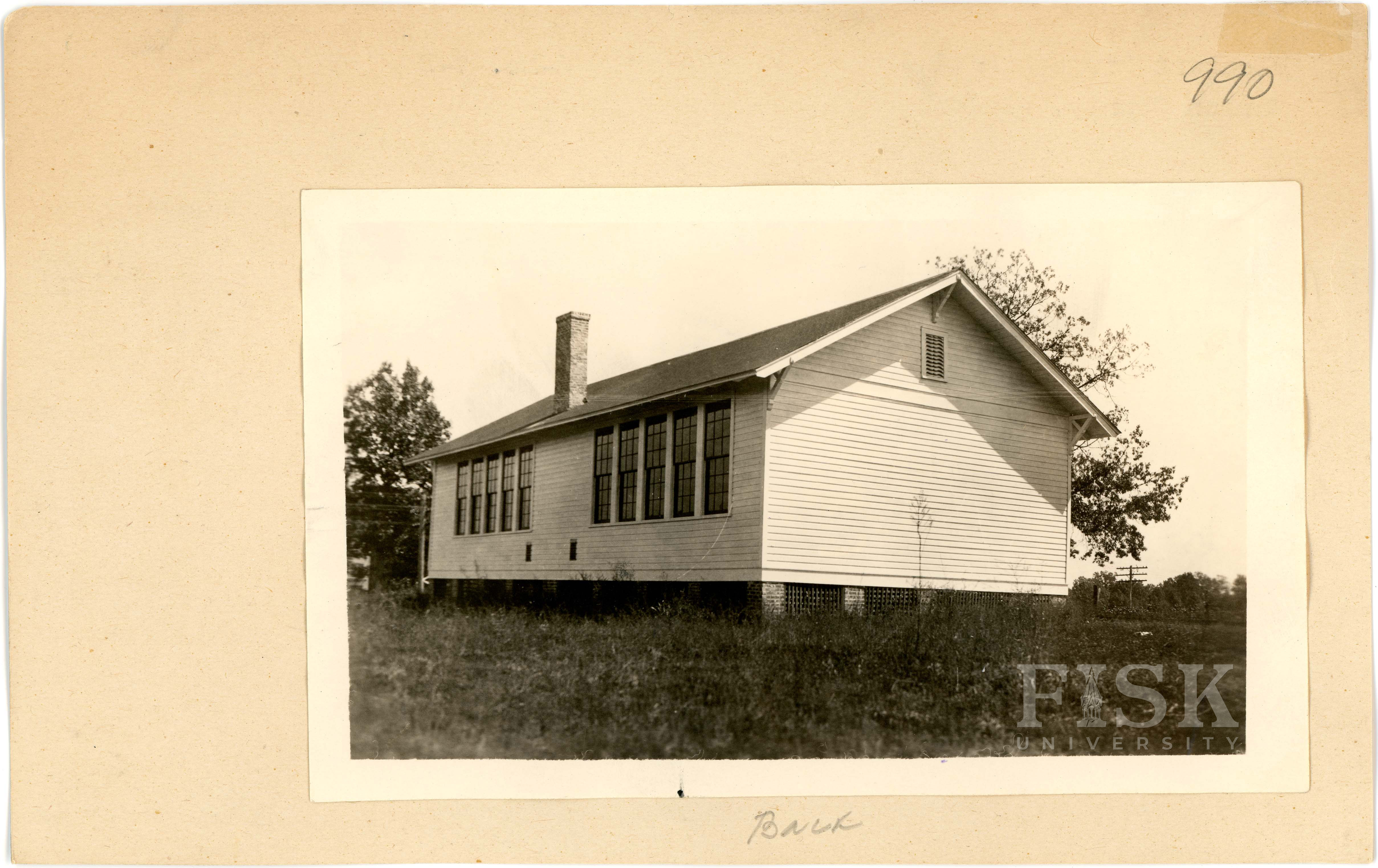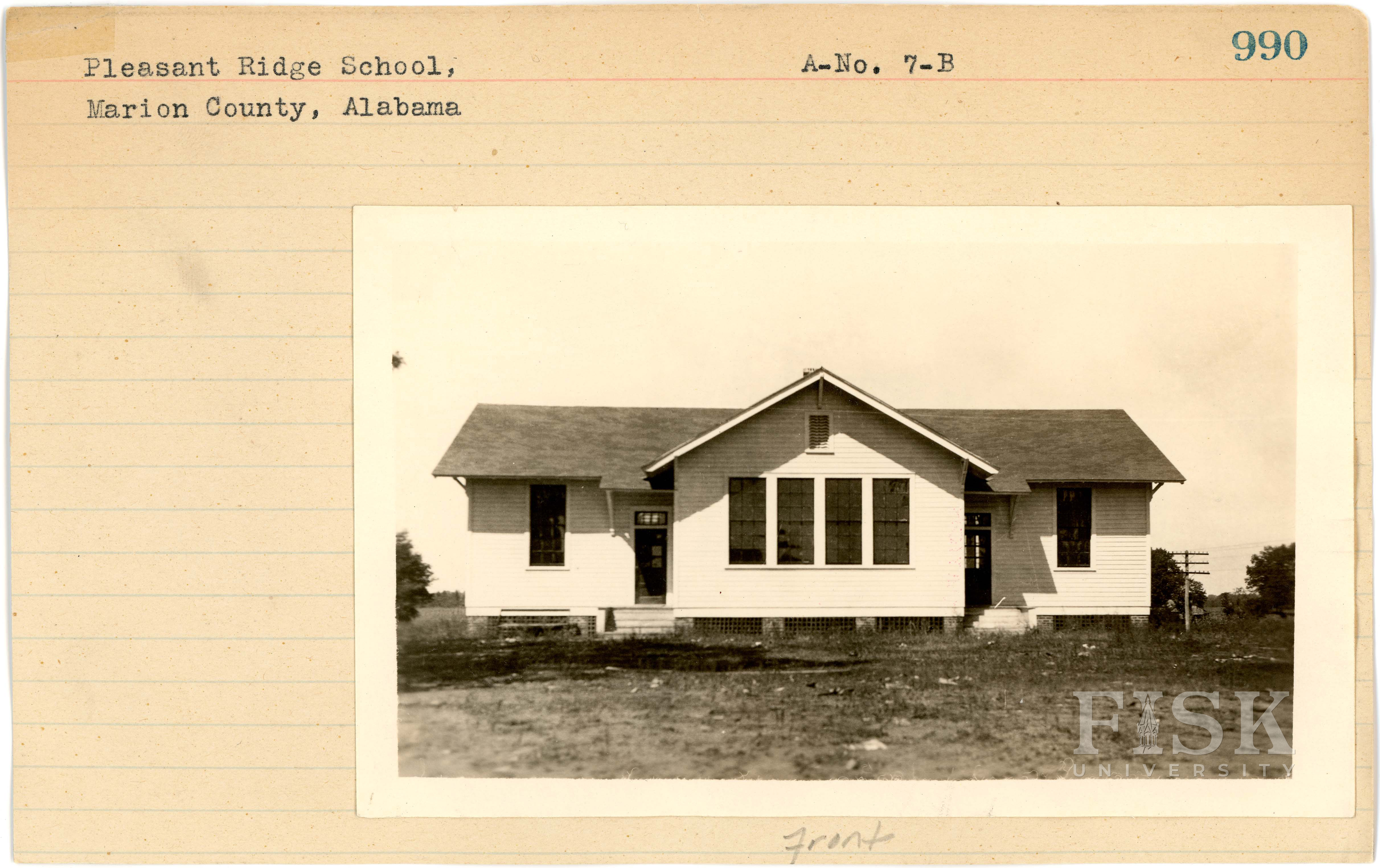 - Photos of Pleasant Ridge School in Marion County, Alabama with a note on the front card that says, "Front" and a note on the back card that says, "Back"