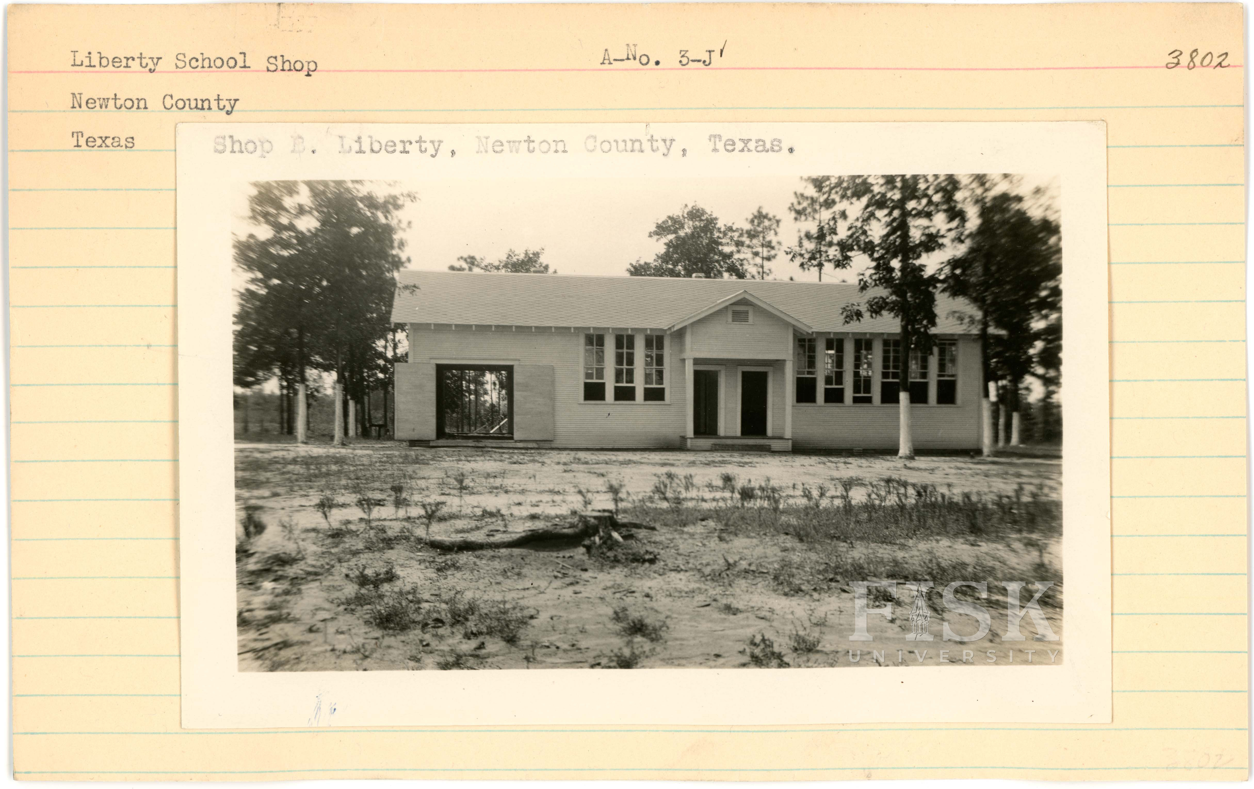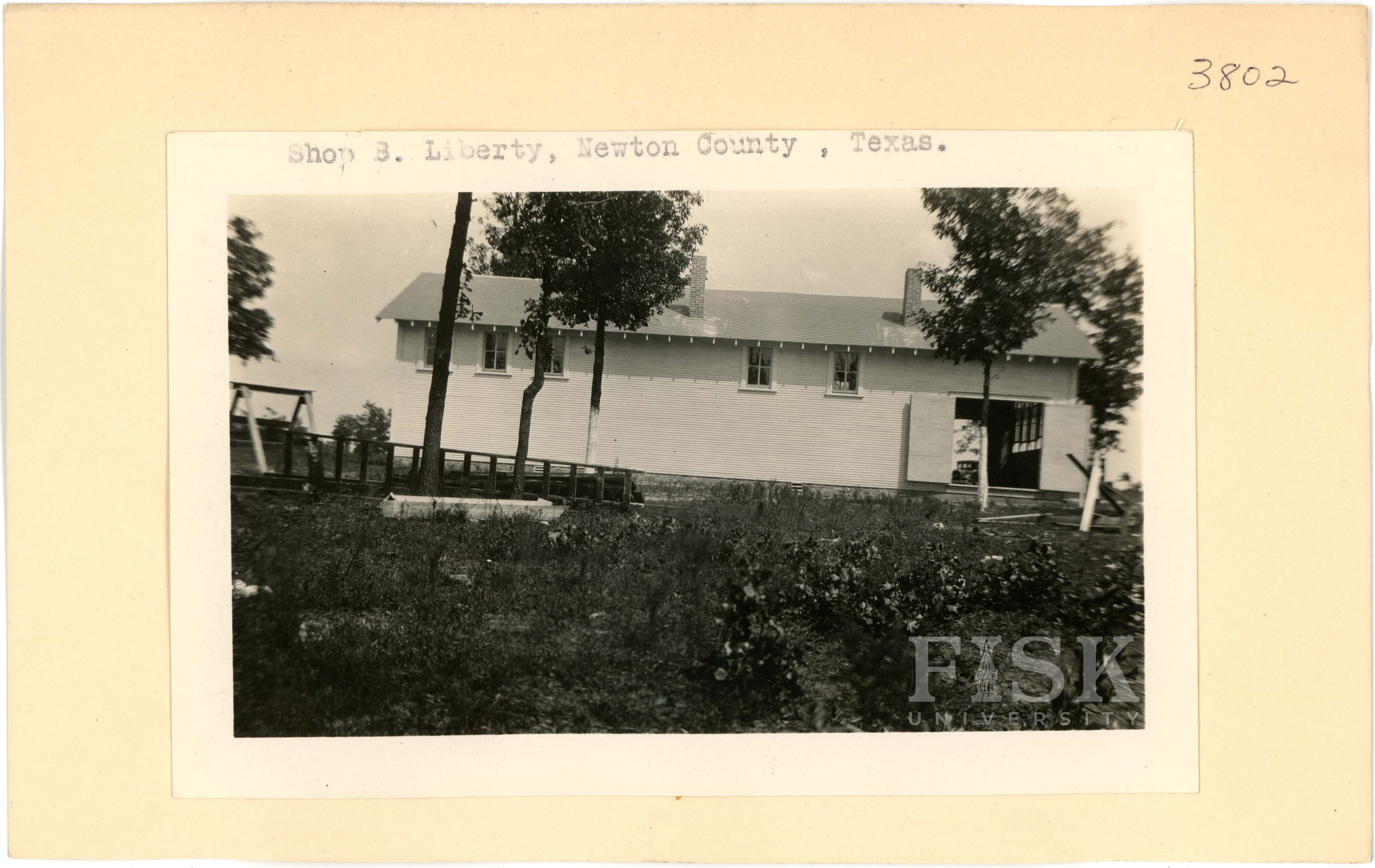 - Photos of the shop at Liberty School in Newton County, Texas with a note on the photo that says "Shop B. Liberty, Newton County, Texas."