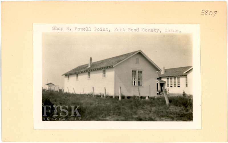 - Photos of the shop at Powell Point School in Fort Bend County, Texas with a note on the photo that says "Shop B. Powell Point, Fort Bend County, Texas."