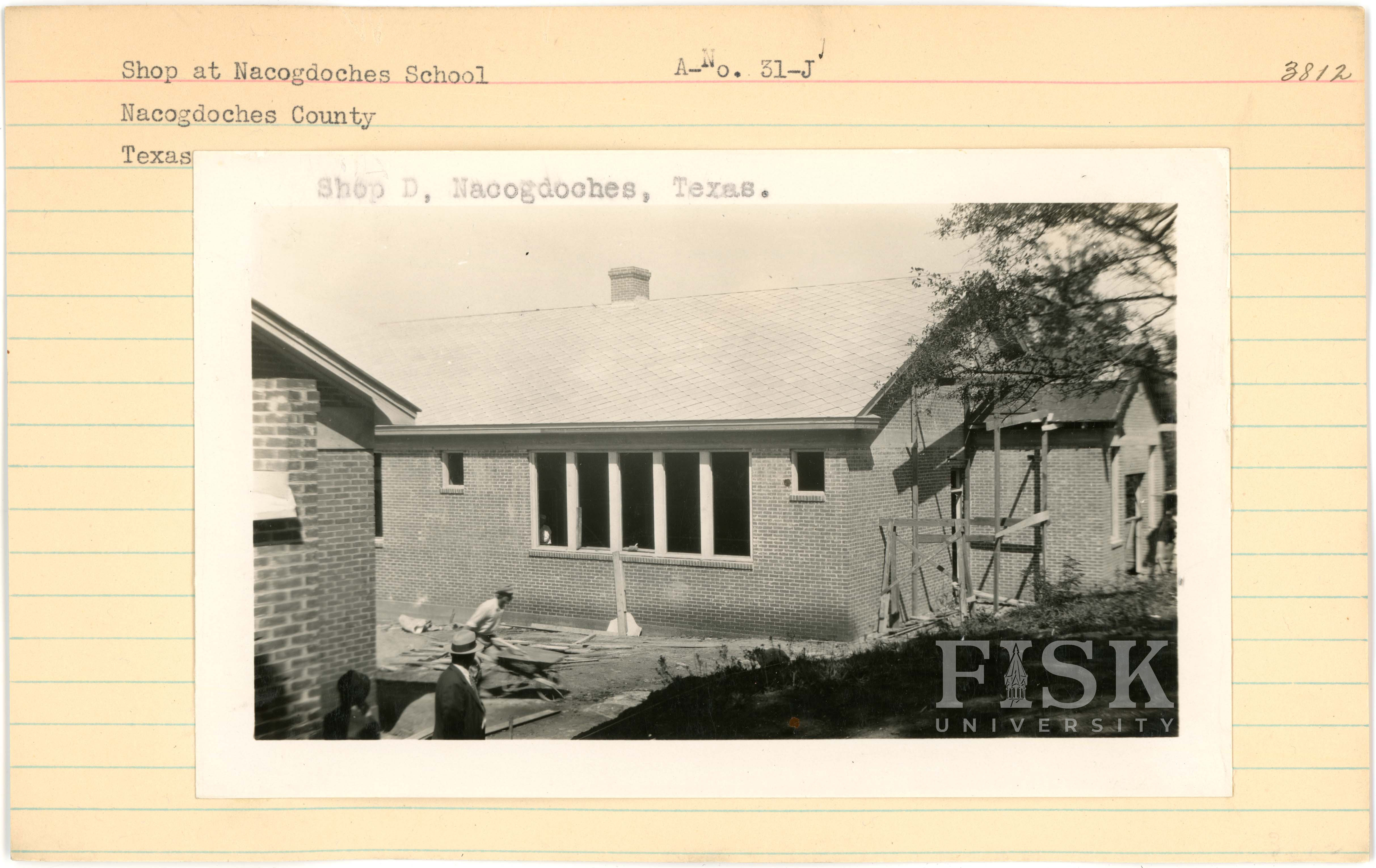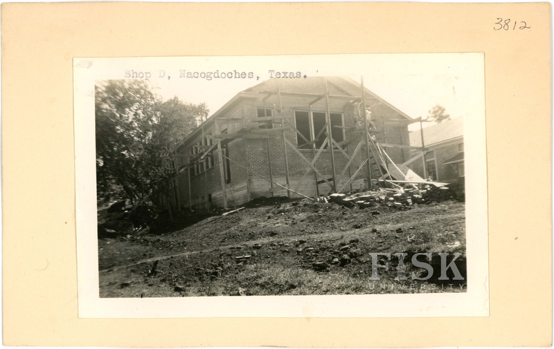 - Photos of the shop at Nacogdoches School in Nacogdoches County, Texas under construction with a note on the photo that says "Shop D, Nacogdoches, Texas."
